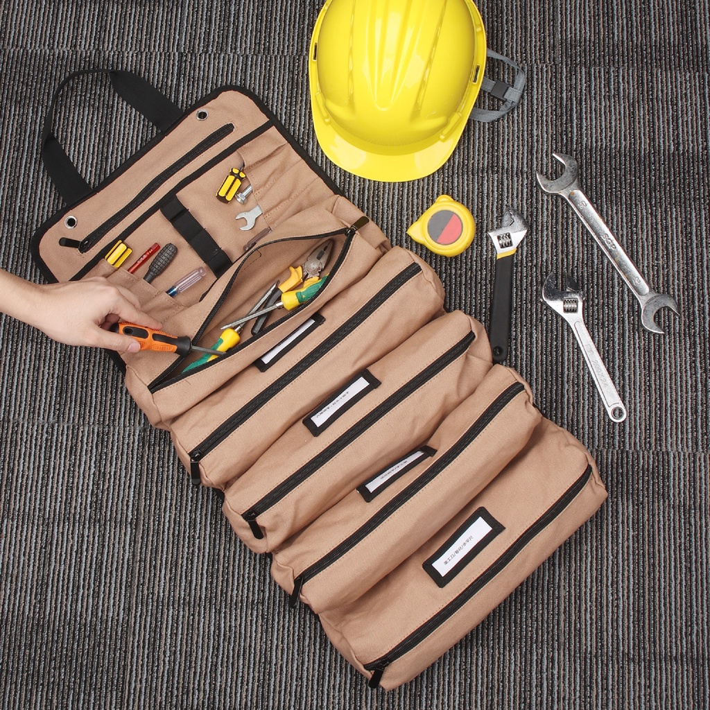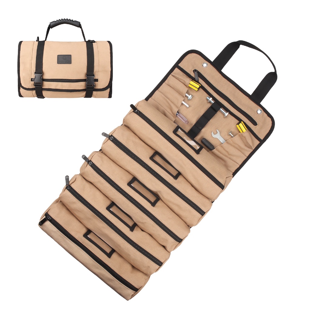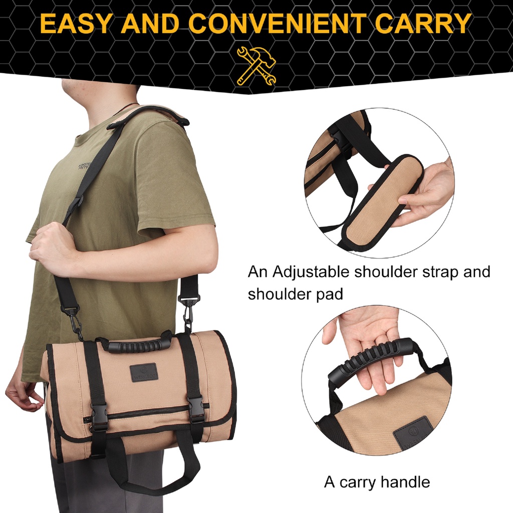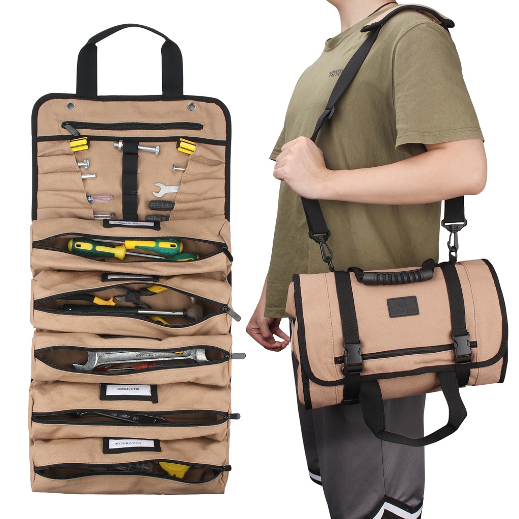 Wessleco Large Canvas Roll Up Tool Bag With Shoulder Strap Multifunction Electrician Tool Storage Bag Portable Tool Shou