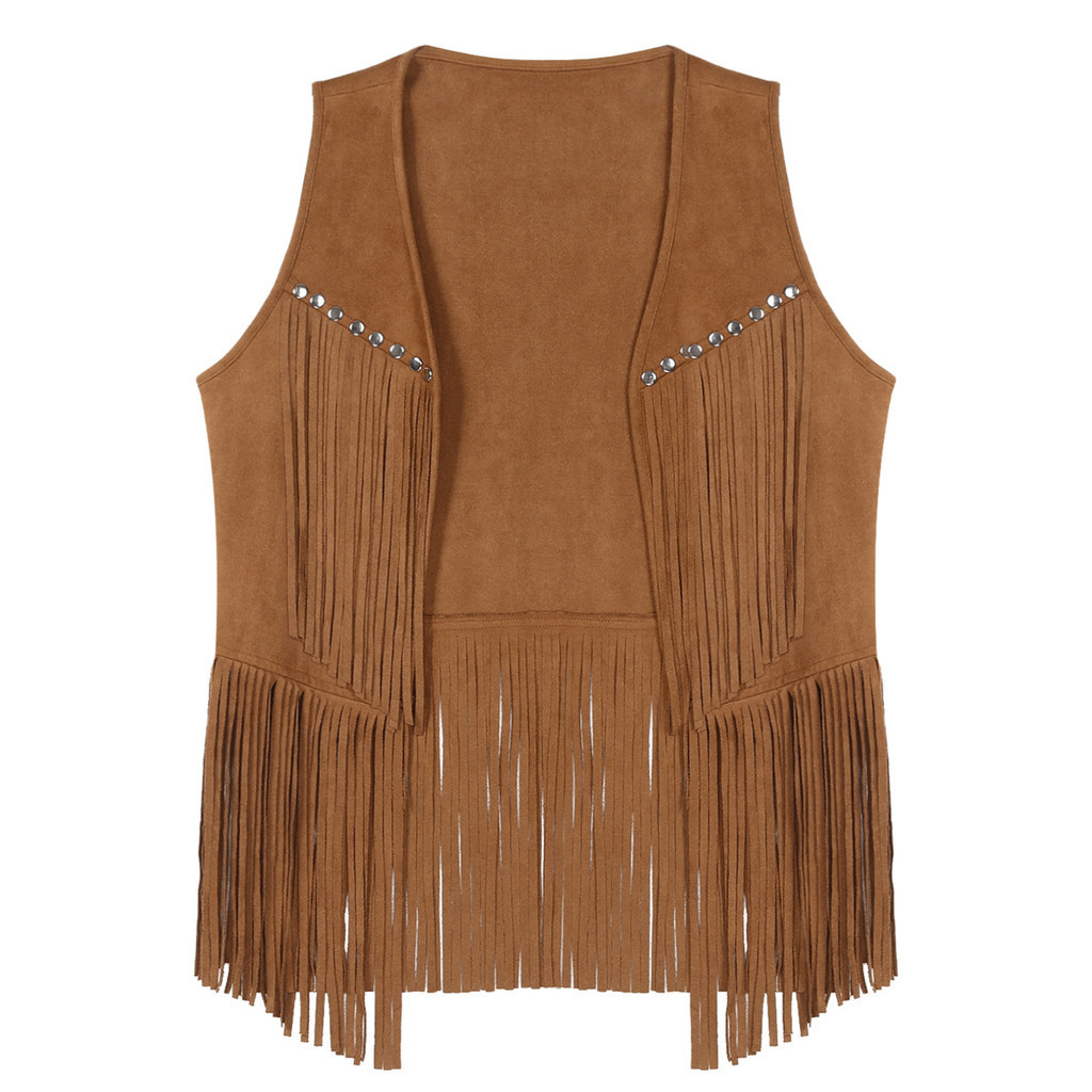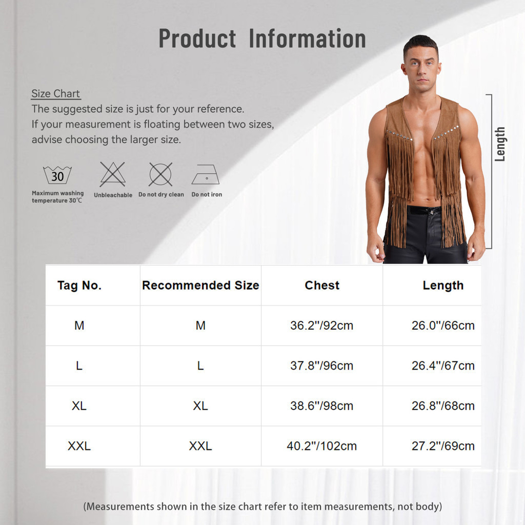 Western Cowboy Costume Mens Faux Suede Tassel Waistcoat Fashion Sleeveless Open Front Vest Rivets Fringed Cowboy Cosplay Coat