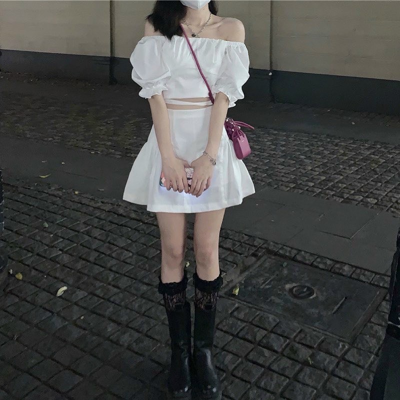 White dress Set includes off-the-shoulder top + skirt with pants, back zipper, 2 sizes M L