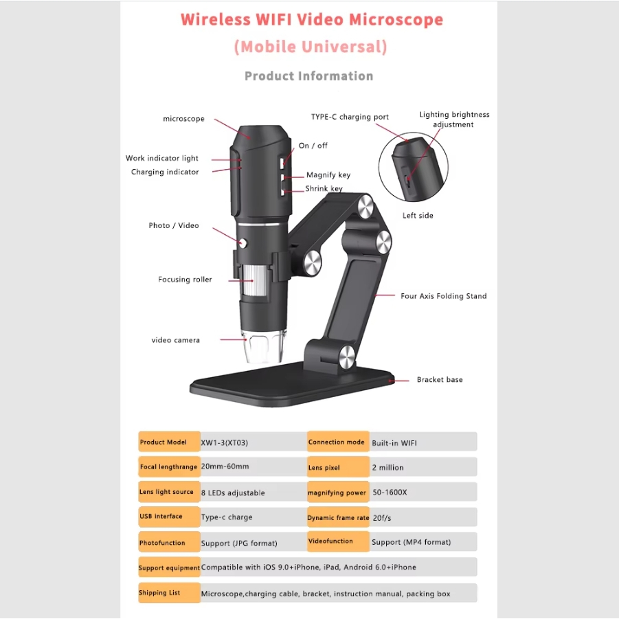 Wifi Digital Microscope 50X-1600X HD Electronic Microscopes With Adjustable Stand 8LED Compatible with Android/iOS For mobile phone Repair