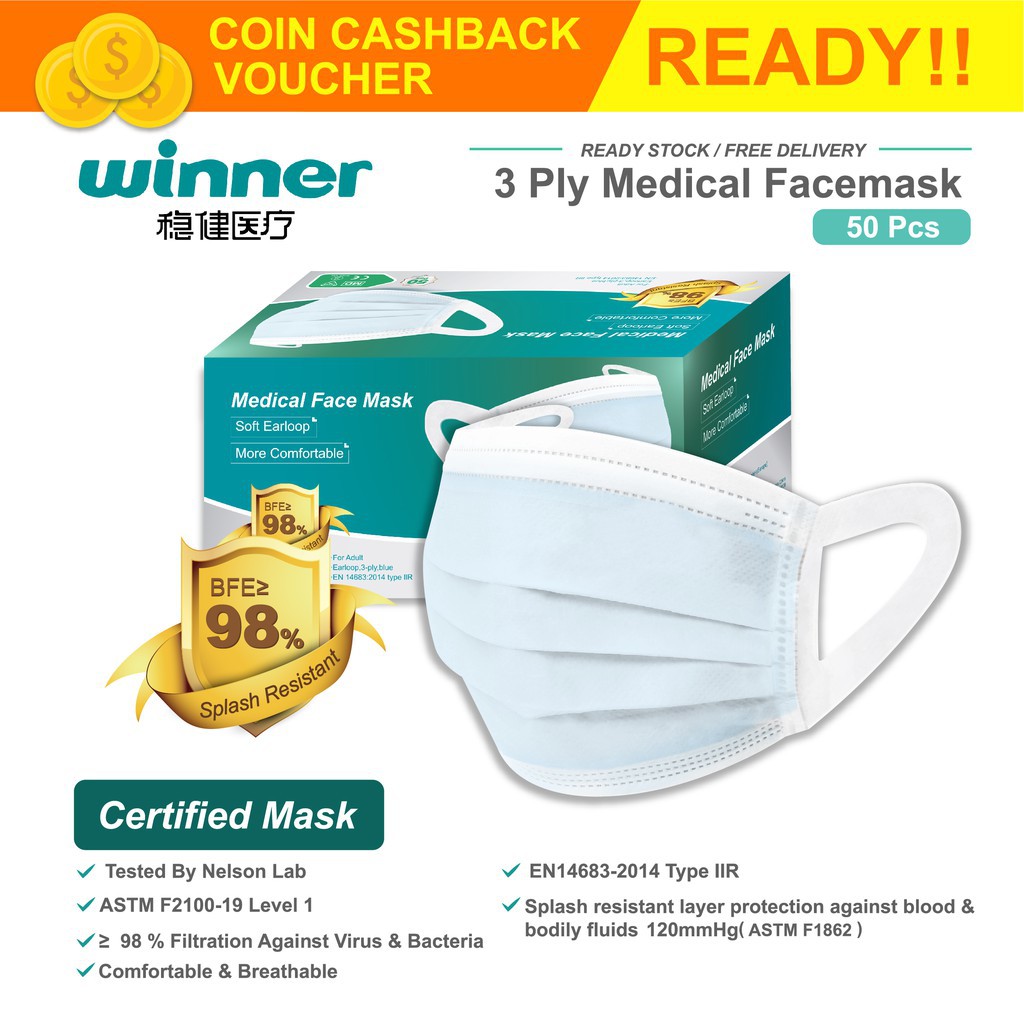 Winner Medical 3 PLY Face Mask 50pcs ( Soft Earloop ) / Normal 3 PLY DISPOSABLE MASK