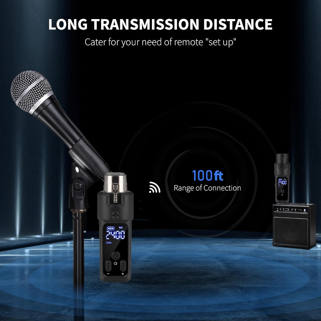 Wireless XLR Microphone Transmitter Receiver Rechargeable 2.4GHz Plug-on Wireless Microphone Adapter for Dynamic Microphone/Audio Mixer/Electric Guitar Bass