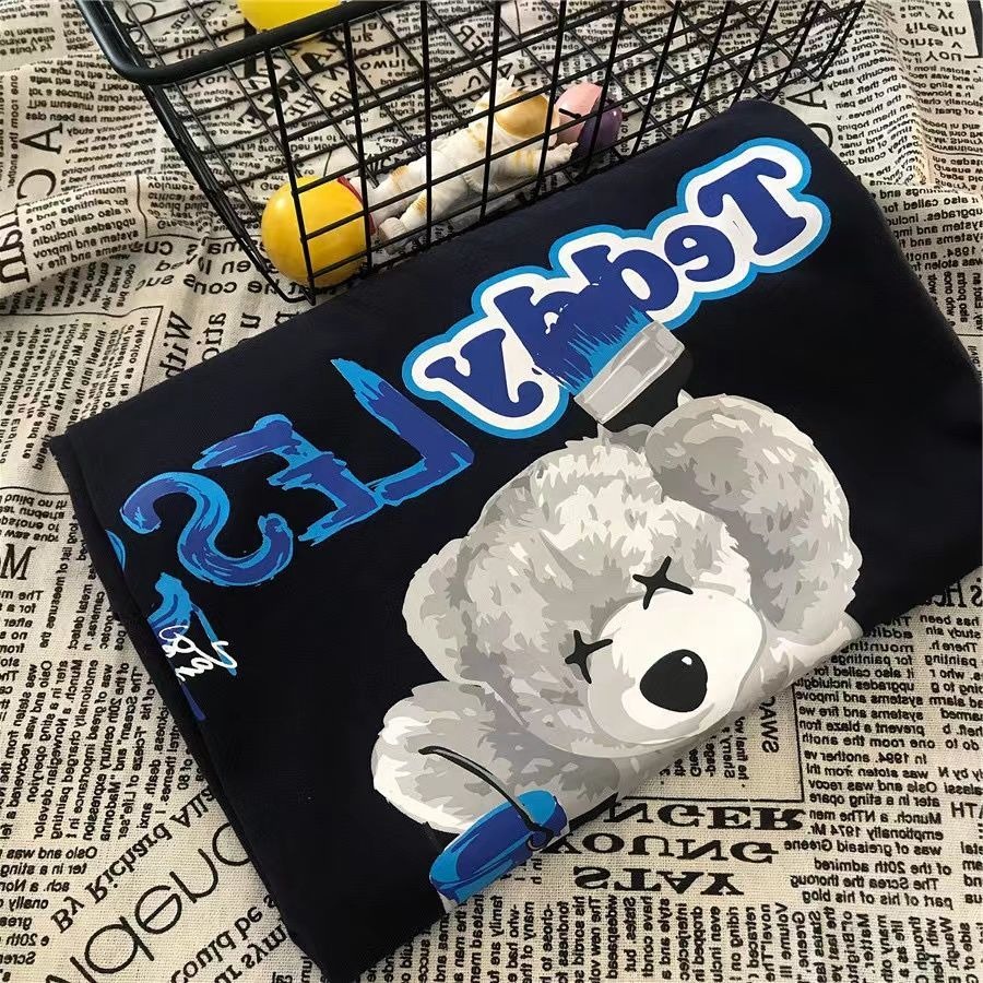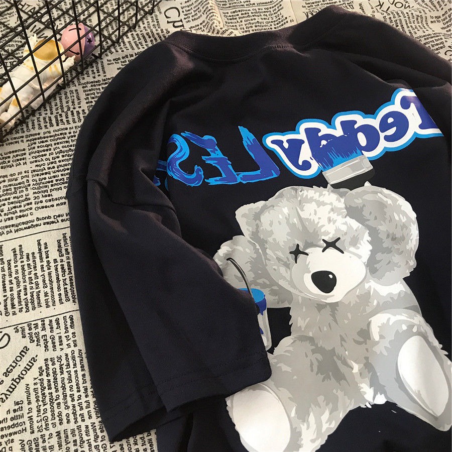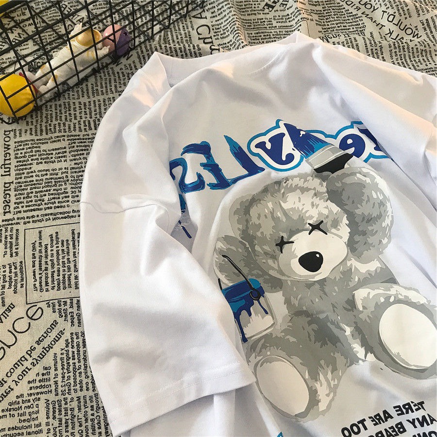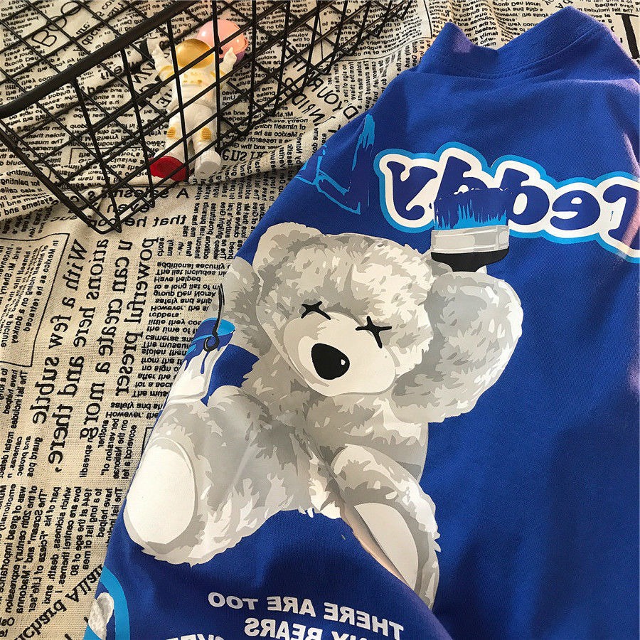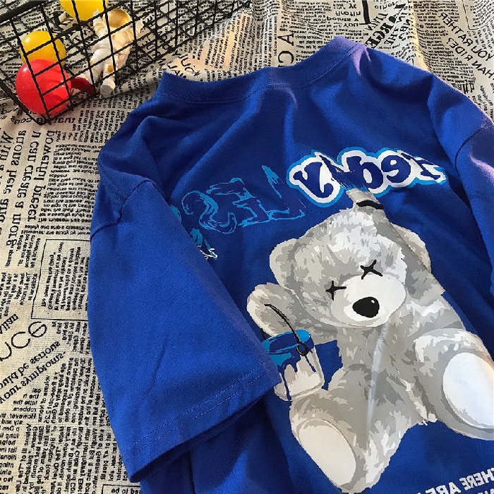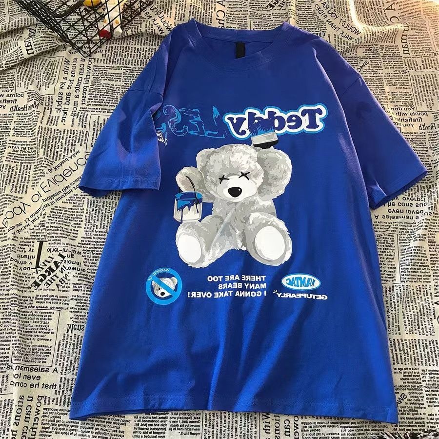 (Size S-3XL) Women's Korean Super Cute Bear Print Short Sleeve T-Shirt Oversized Round Neck Blue Top Vintage Clothes