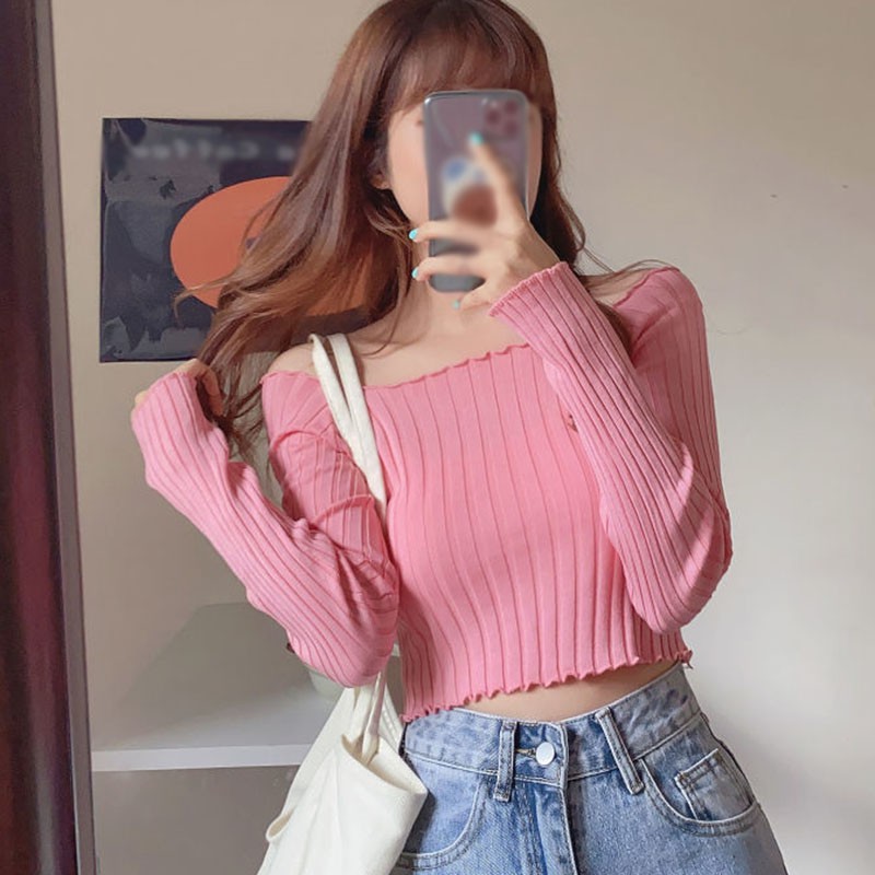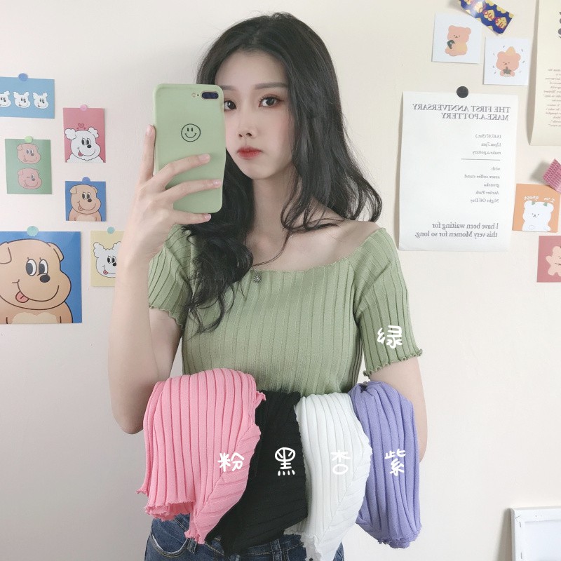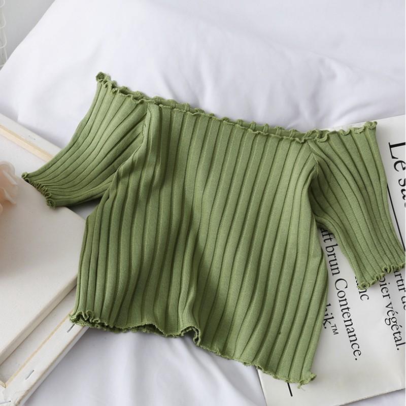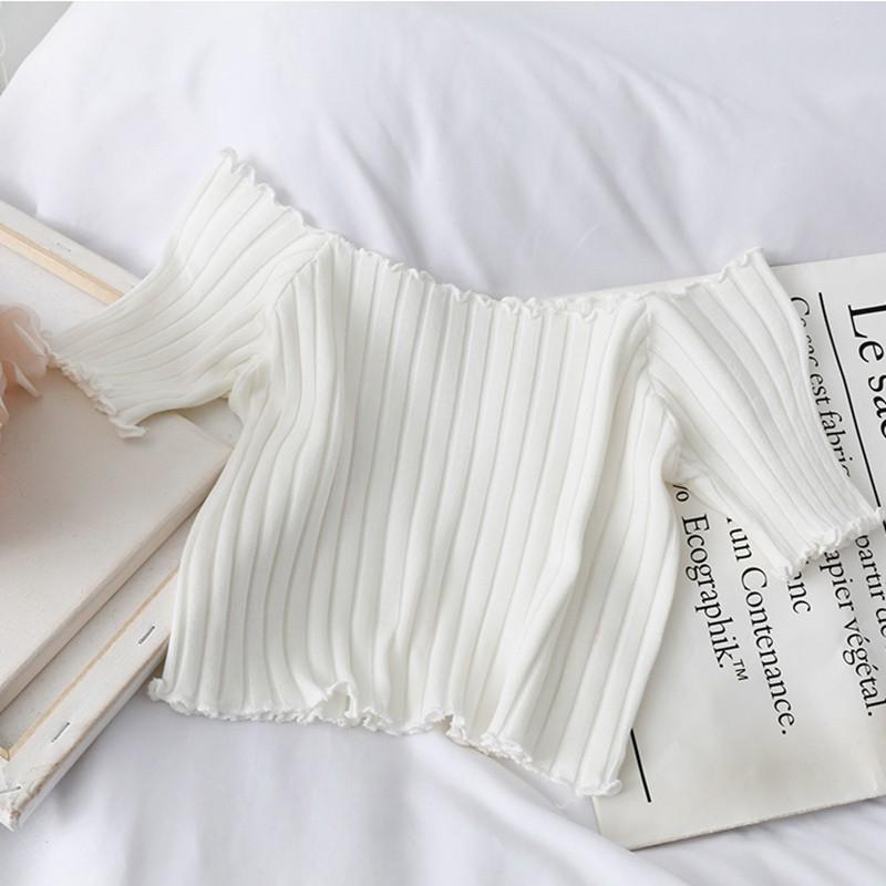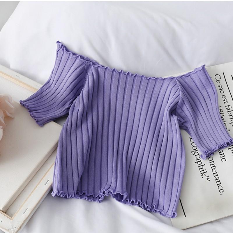 Women's Blouse Sexy Slash Neck Solid Short Sleeve Knitted Ruffles Crop Top tshirt women