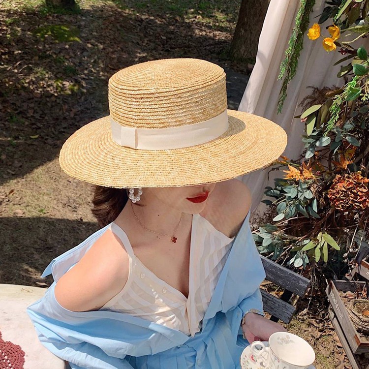 Women's Boater Beach Hat Wide side Female Casual Panama Hat Lady Classic Flat Bowknot Straw Sun Hat Women Fedora