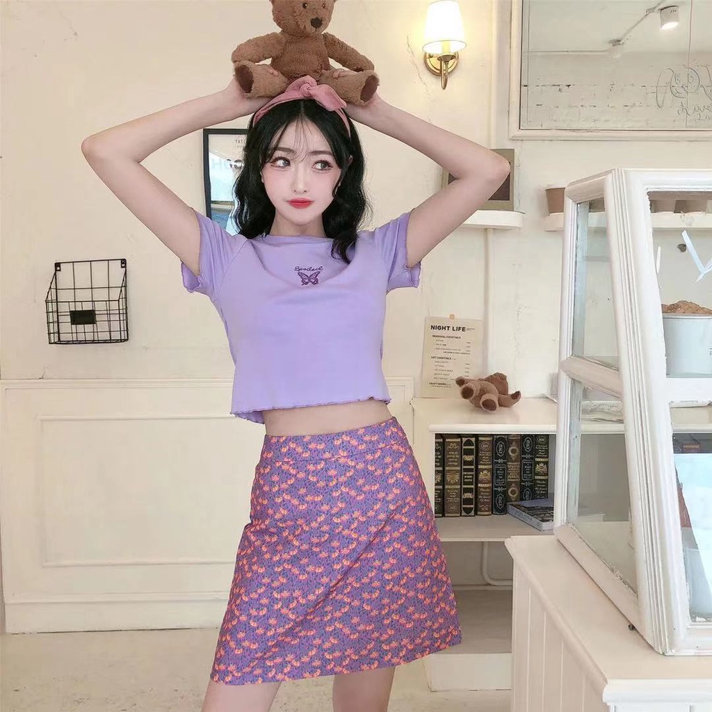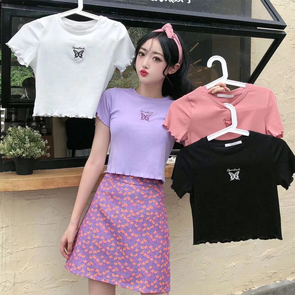 Women's High Waist Cropped Short T-shirt Butterfly Embroidery Crop Top