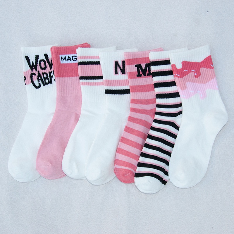 Women's Pink tube socks pure cotton ins fashionable student sports socks spring and autumn striped tube stockings