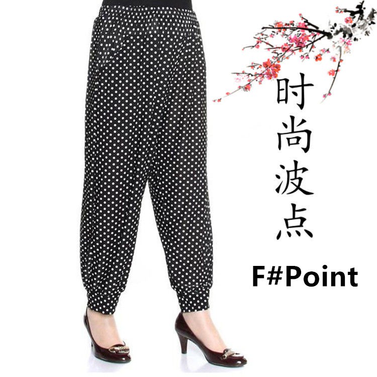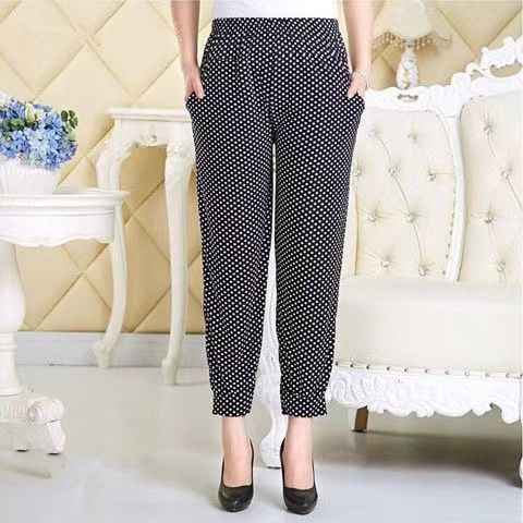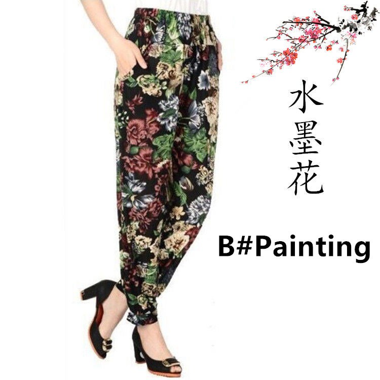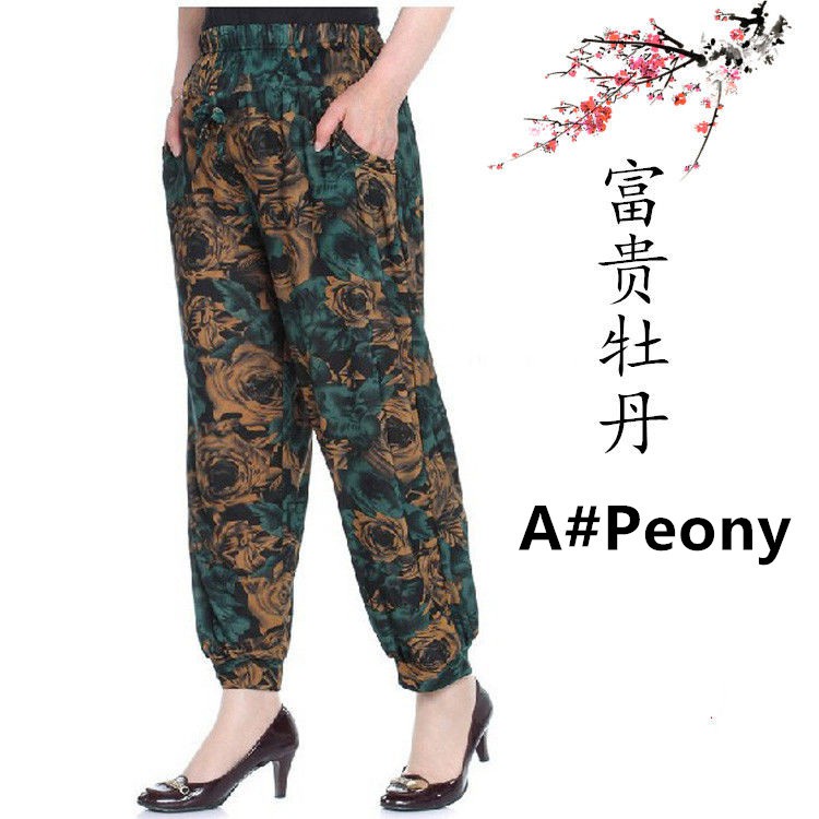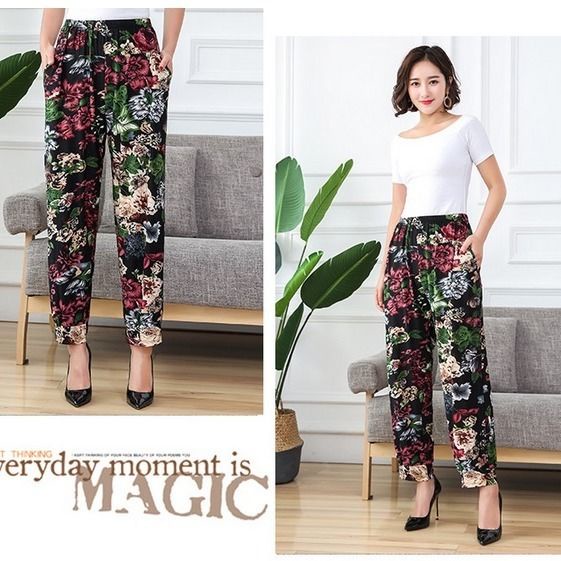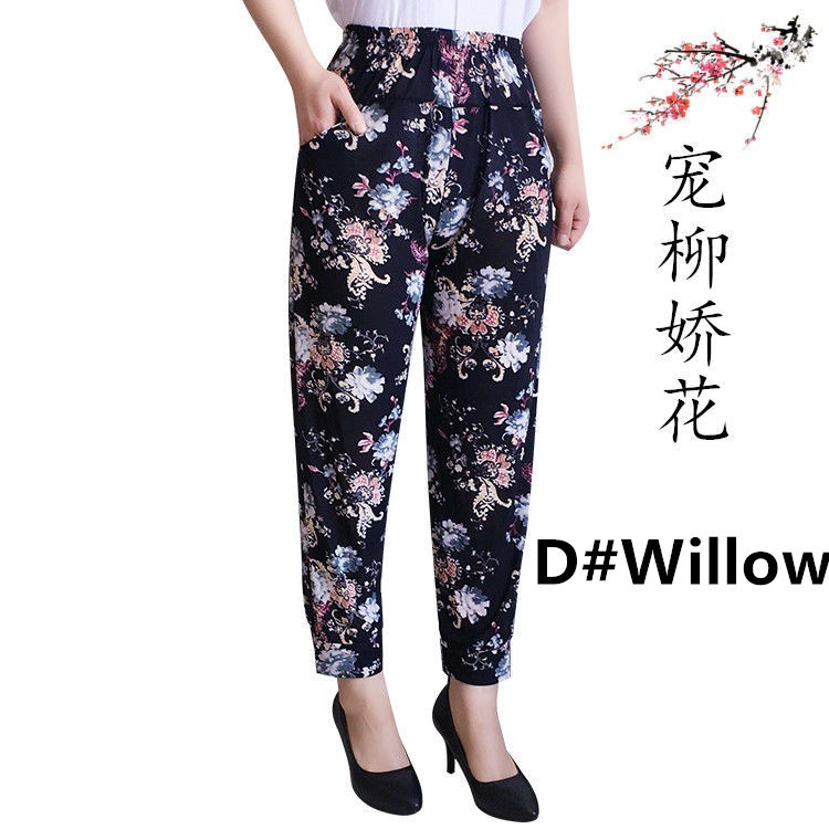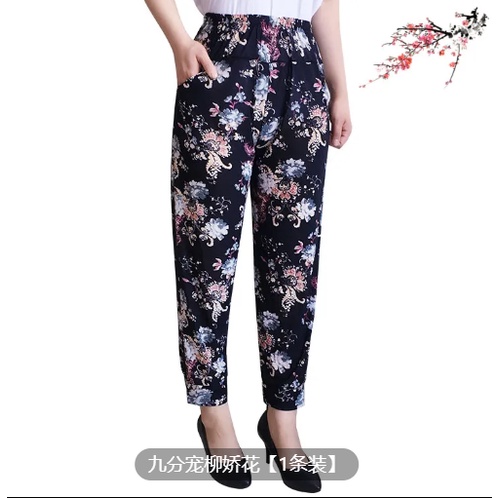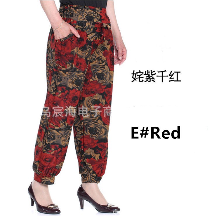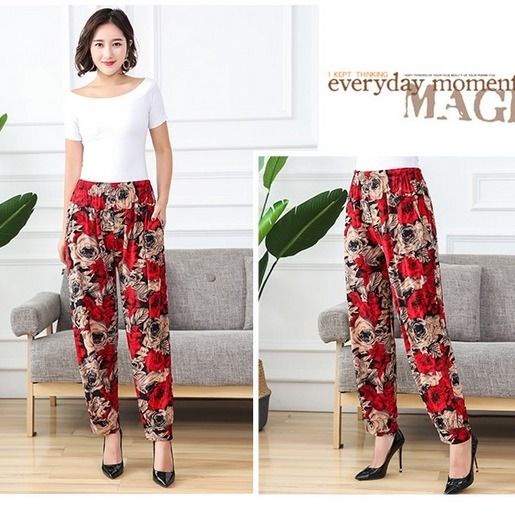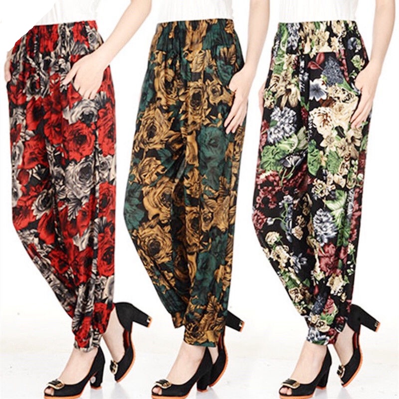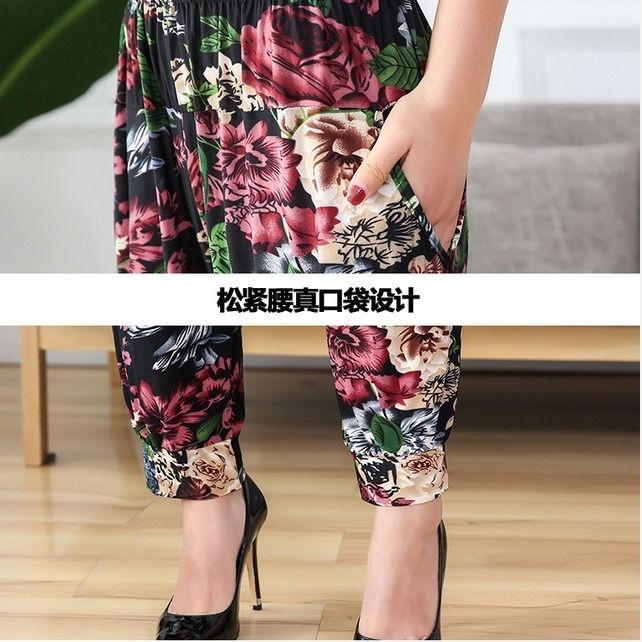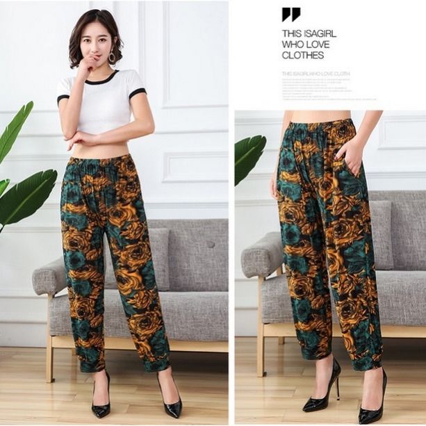 Women Ice Silk Pants Floral Cool Pants Loose Beach Mother Pants
