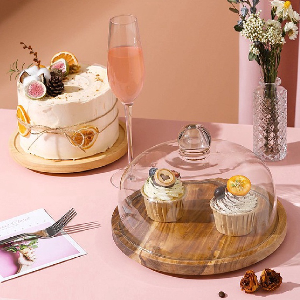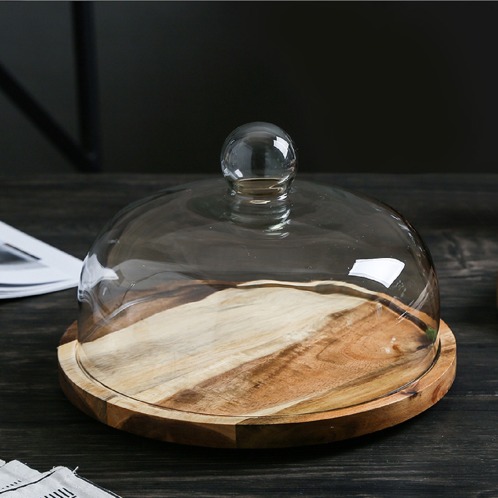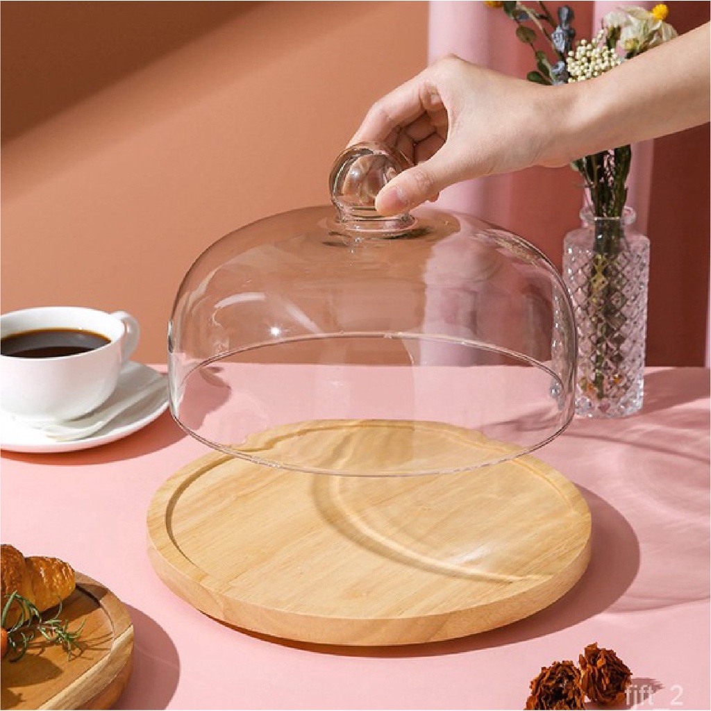 Wooden Round Cake Tray With Cover Glass Dessert Serving Tray Wood Display
