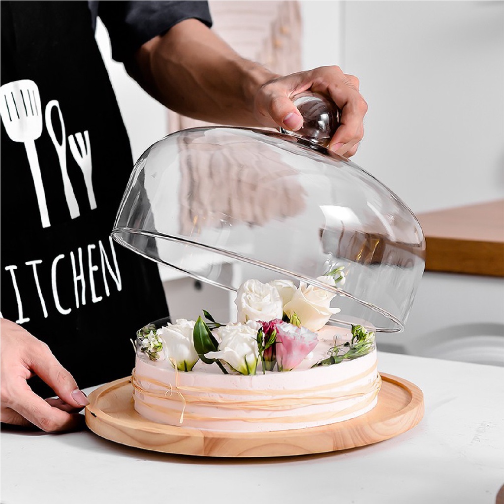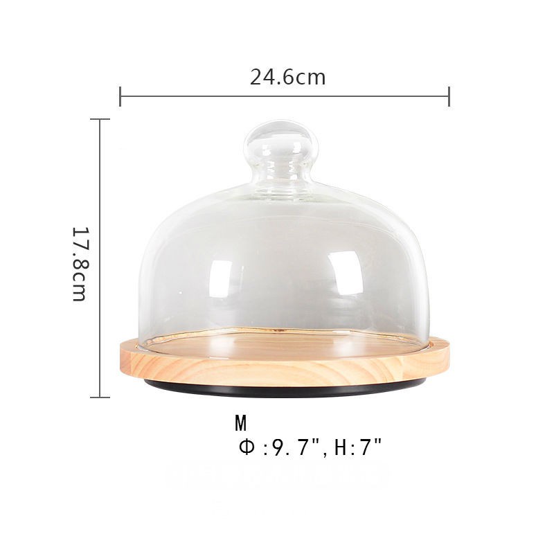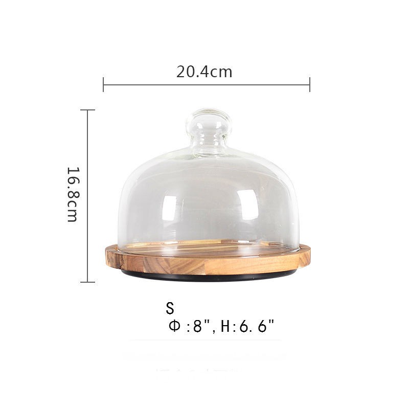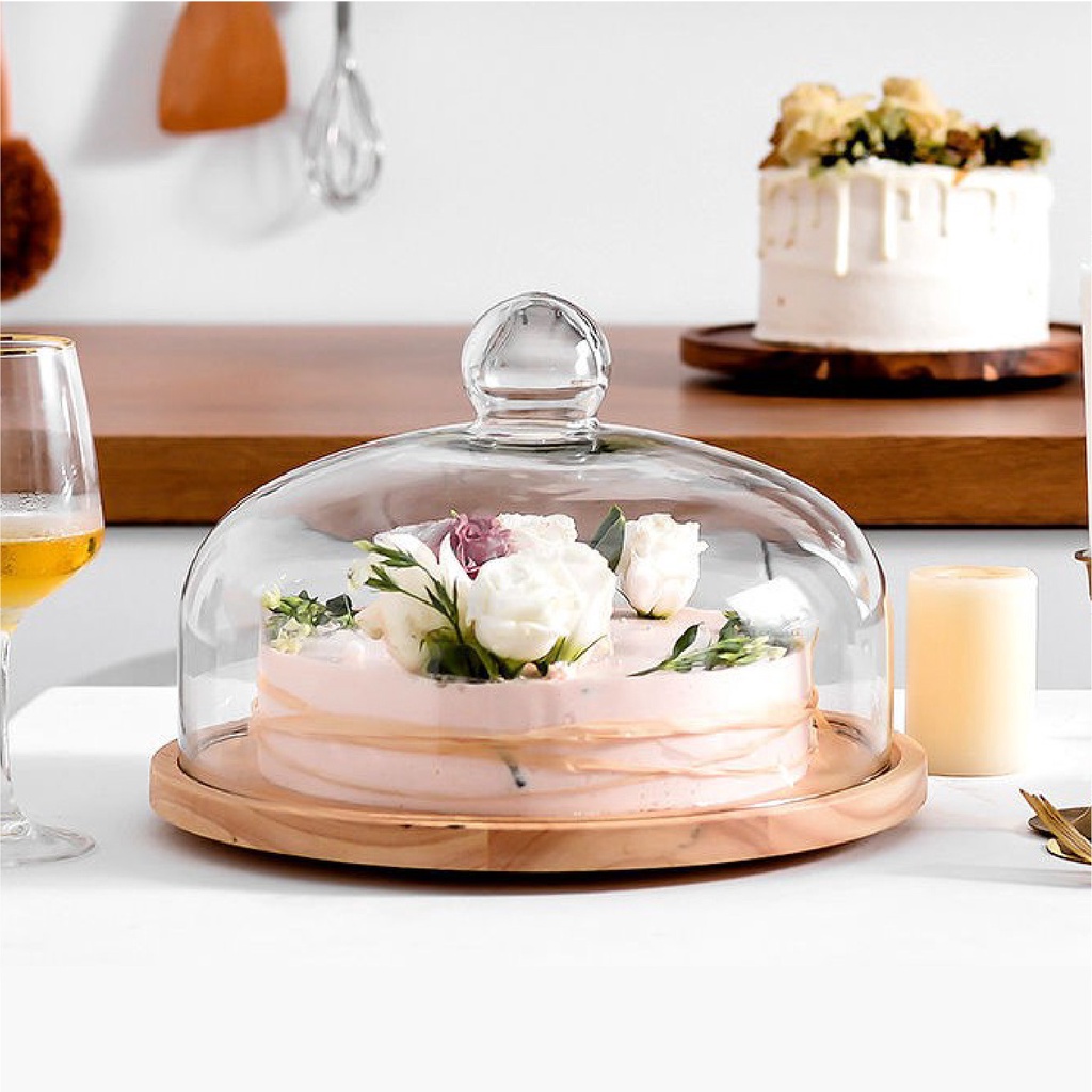Wooden Round Cake Tray With Cover Glass Dessert Serving Tray Wood Display