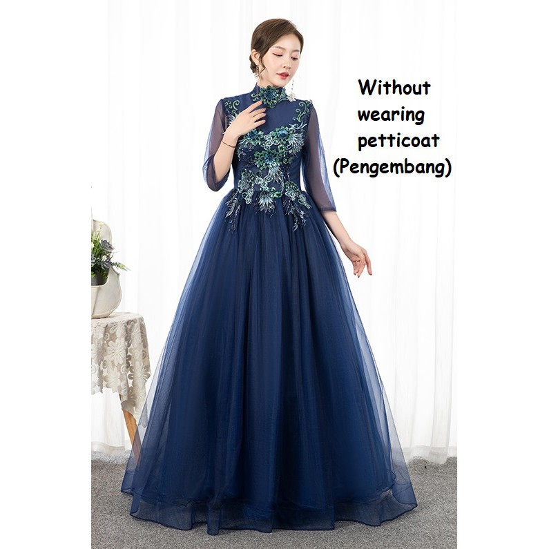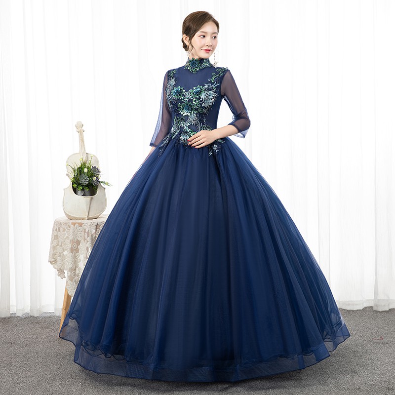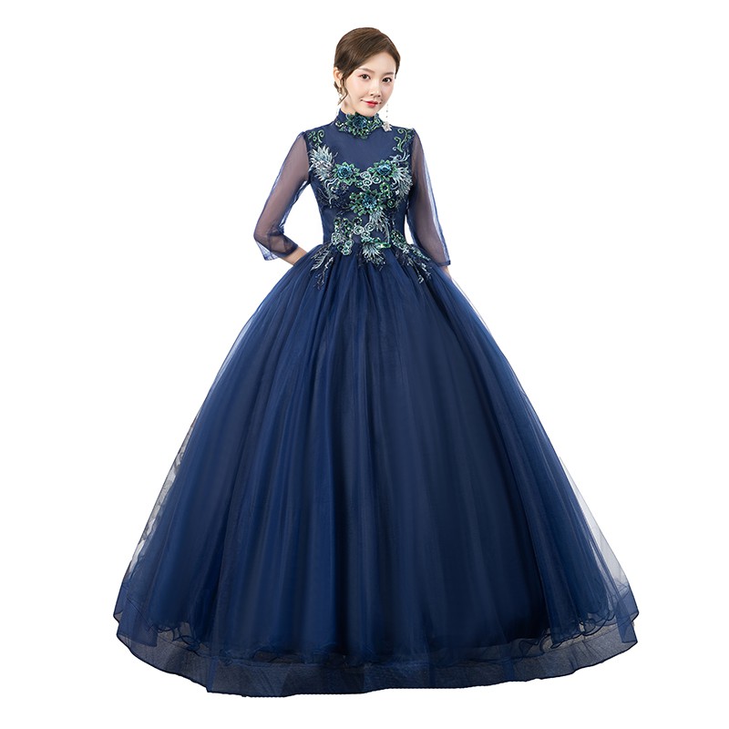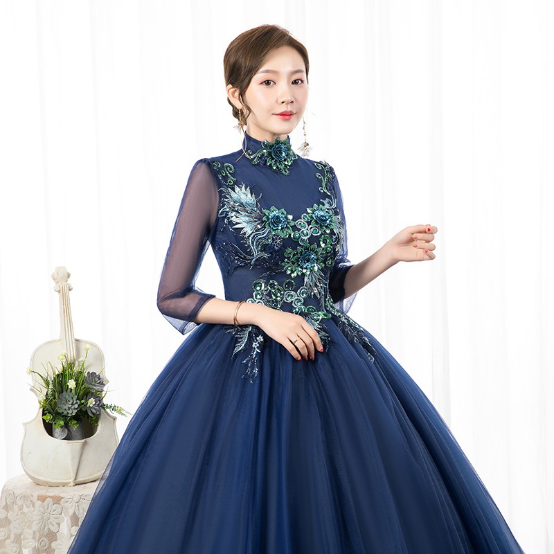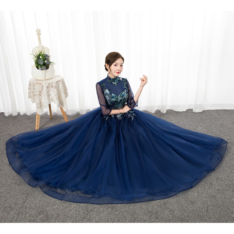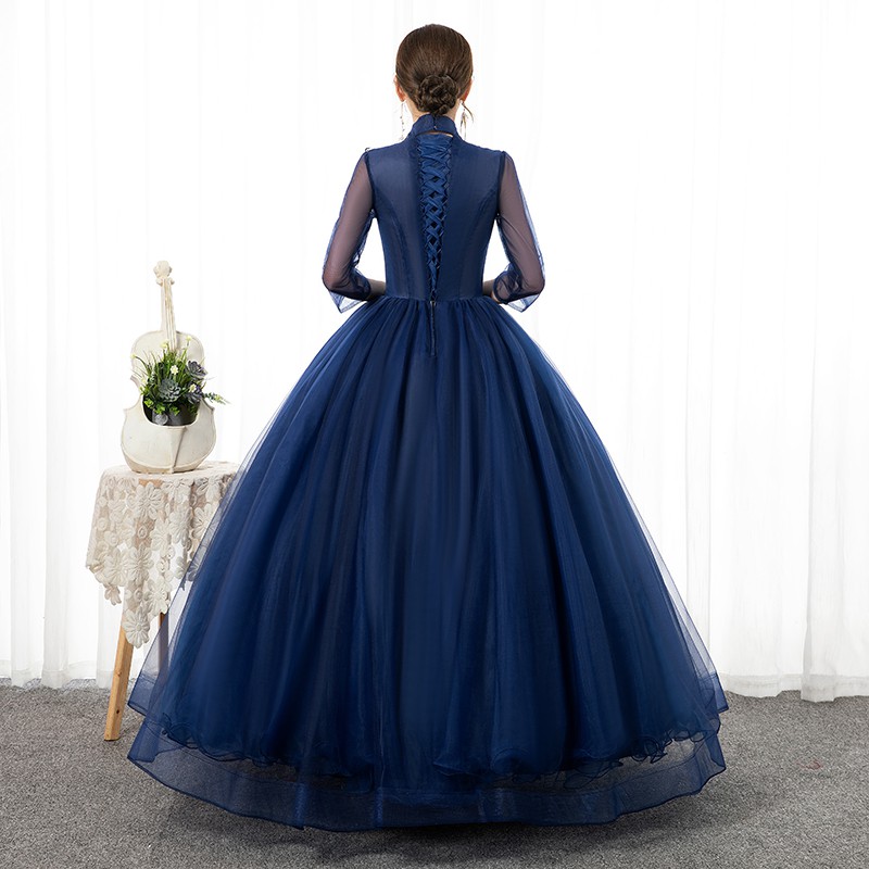XS~2XL Navy Blue High Neck Collared 3/4 Long Sleeve Floral Muslim Pre Wedding Bride Costume Bridal Maxi Dress Gown #8