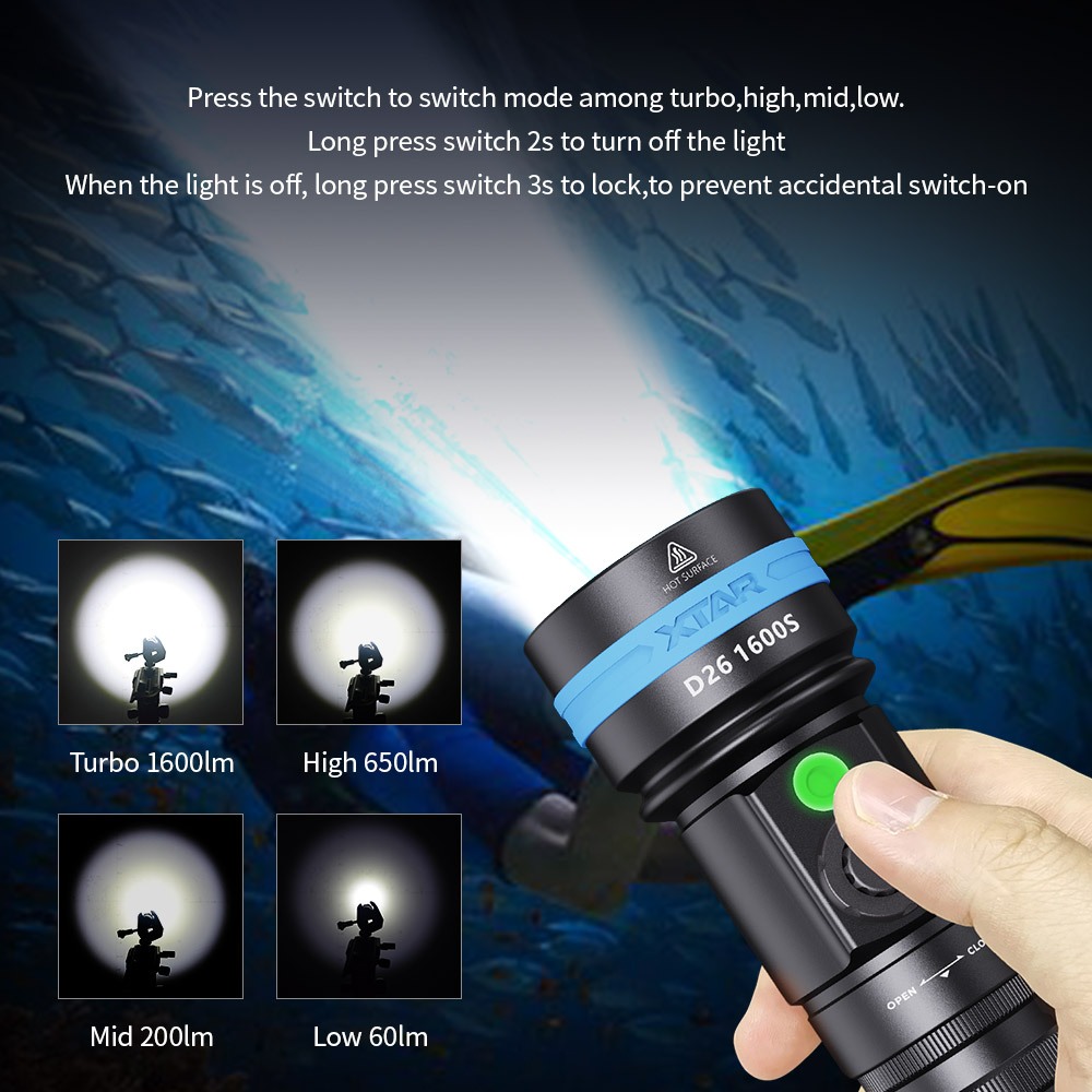 XTAR D26 1600 Lumen Scuba Diving Flashlight Dive Torch Underwater 100 Meters Submarine Lights for Under Water Deep Sea Cave at Night