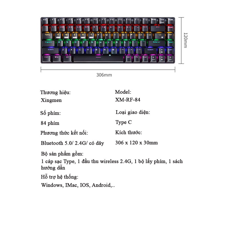 Xinmeng RF84 Led RGB Wireless mini mechanical keyboard 84 keys connecting 3 modes Wire, Bluetooth 5.1 and Wireless 2.4G
