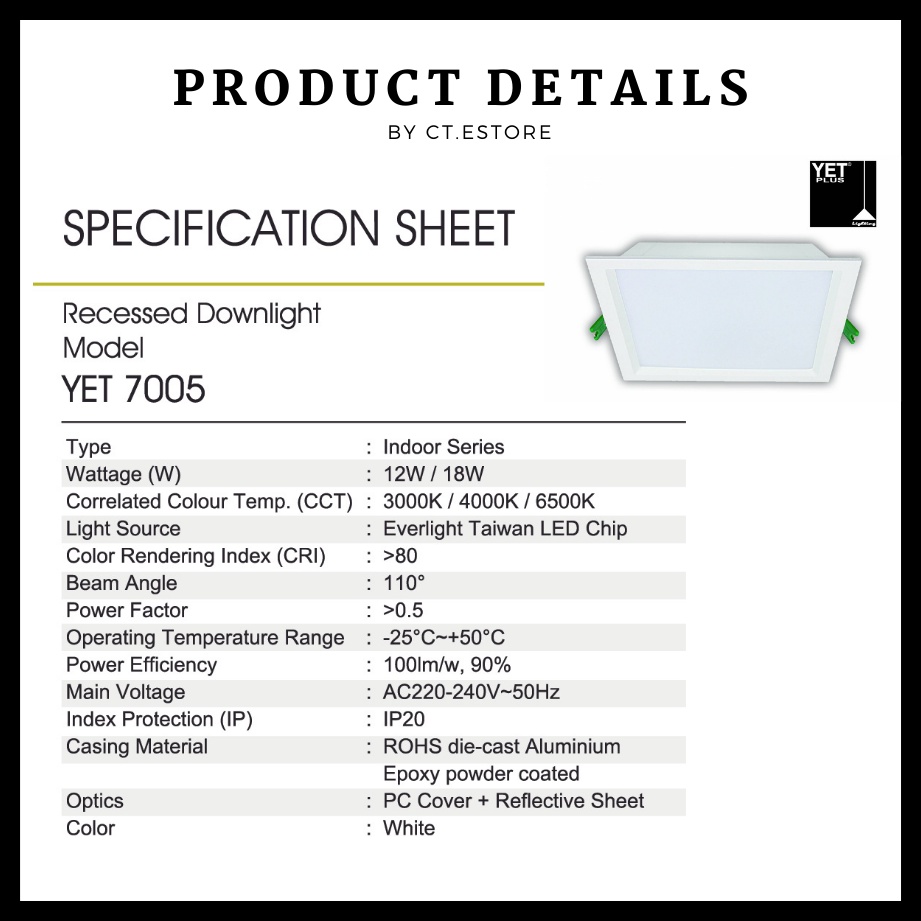 YETPlus LED Downlight Model-Yet-7005-18W 6500K/4000K/3000K Square SIRIM [Ready Stock]
