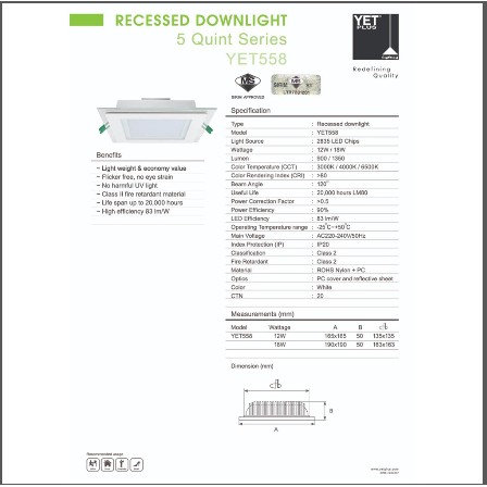YETplus QUINT Series LED Downlight Square Glass (YET-558) [SIRIM APPROVED]