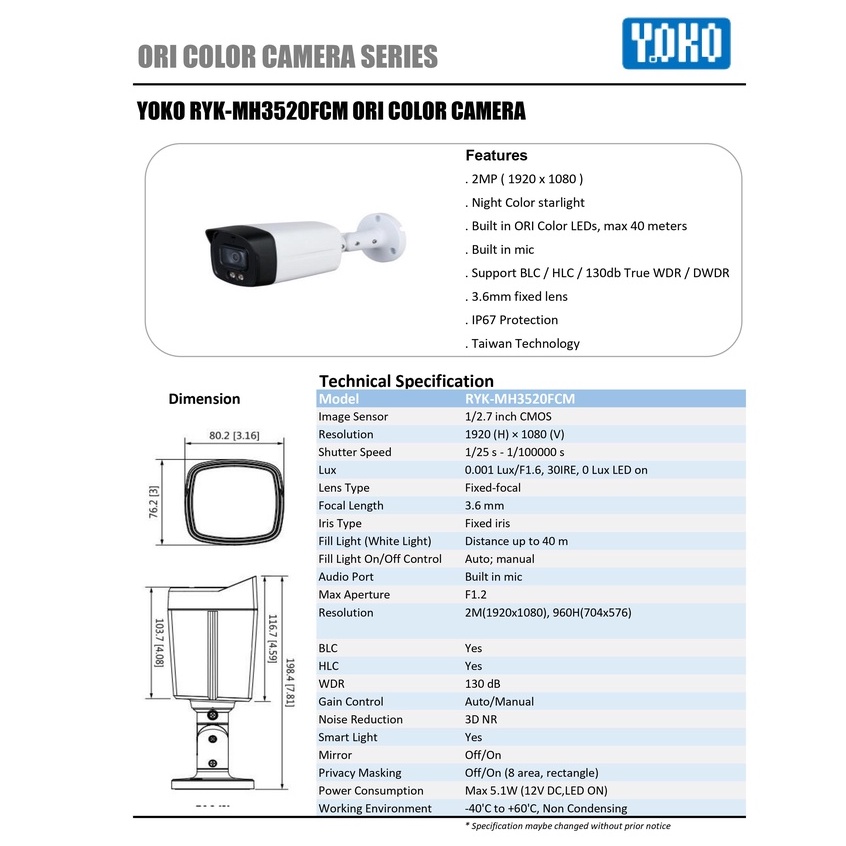 YOKO RYK-MH3520FCM ORI Color Camera +Mic Camera