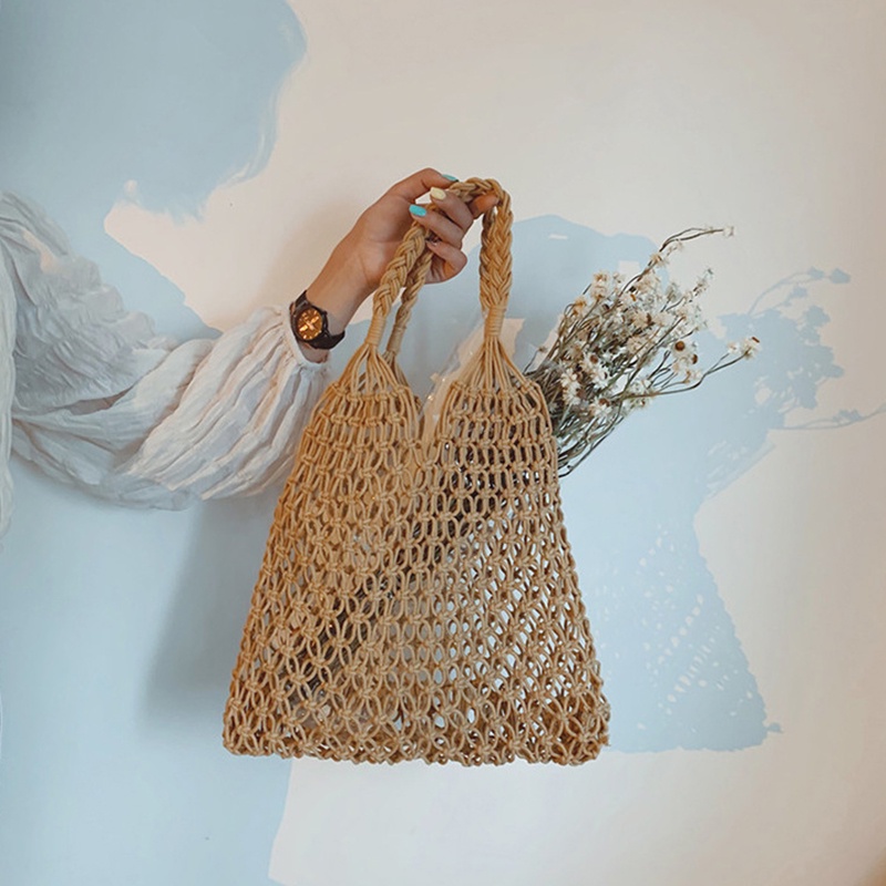 Yogodlns Summer Popular Beach Tote Bag Mesh Rope Weaving Hollow Cotton Lined Shoulder Bag