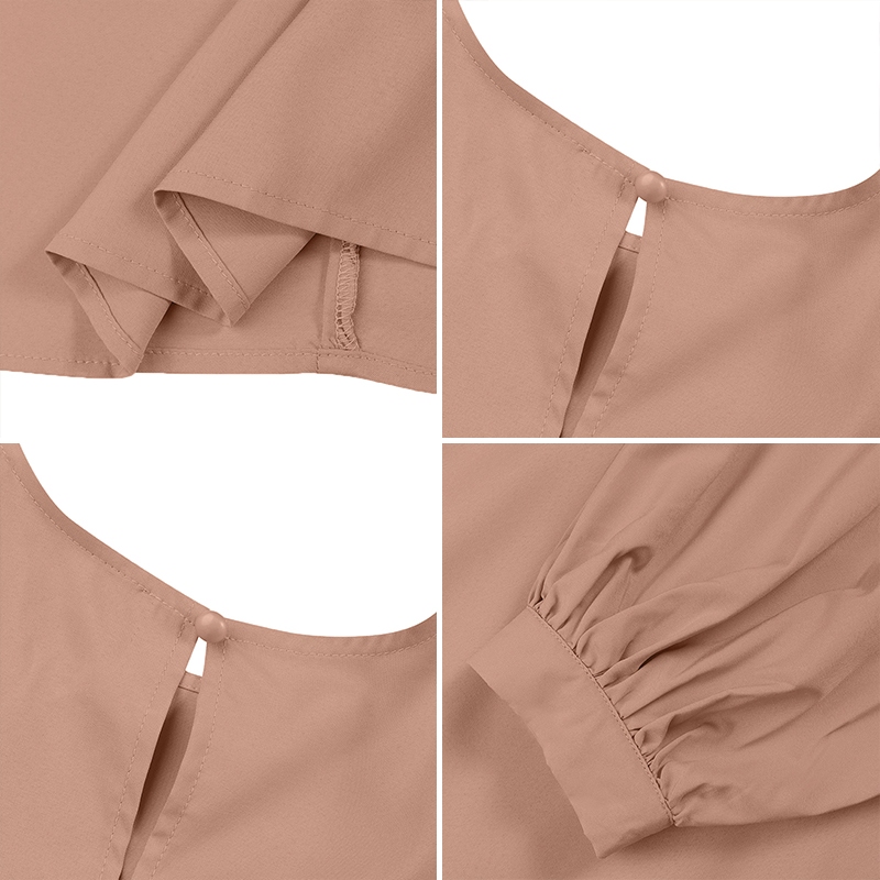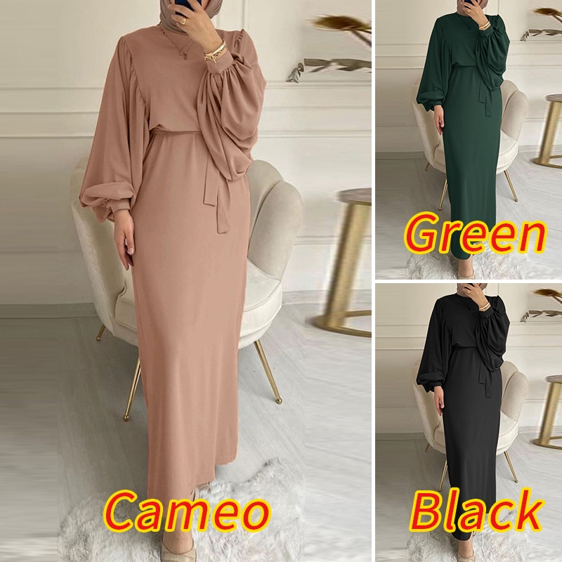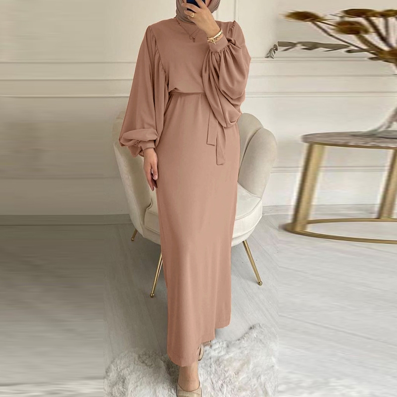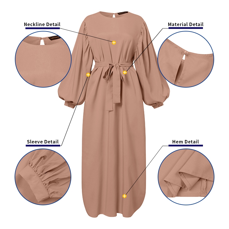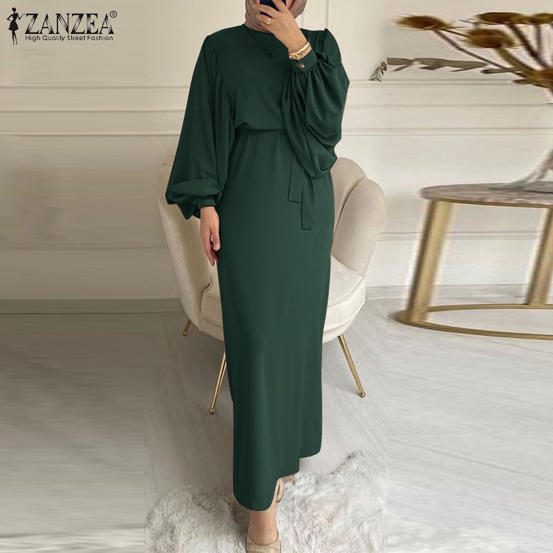 ZANZEA Women Vintage Lace-up Solid Puff Sleeve O Neck Muslim Long Dress