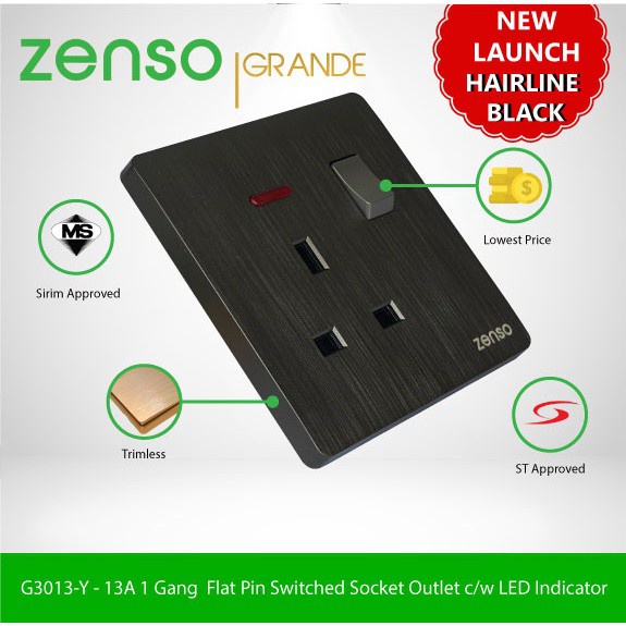 ZENSO Grande Black Color Switches & Socket Suis Lampu Rumah Warna Hitam/Gelap Suiz Soket Socket Plug