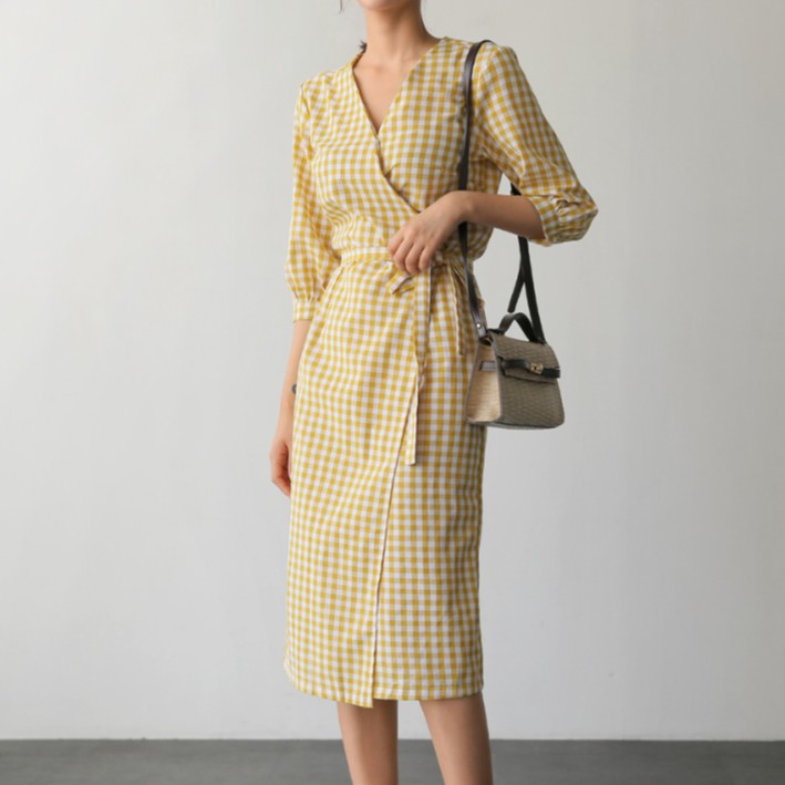 Zuoan Korean Lace Up Plaid Wrap Dress Linen Women Midi Dress