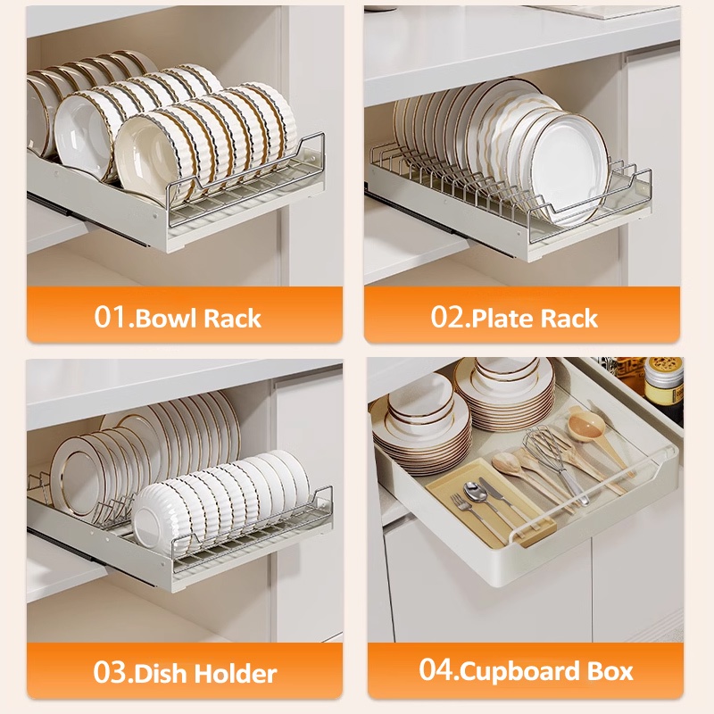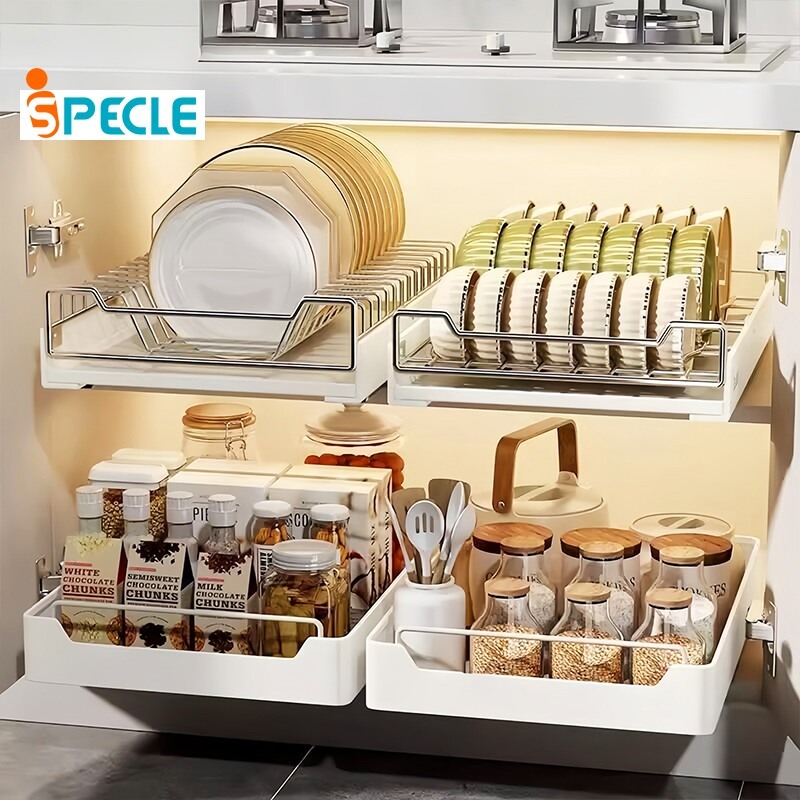 iSPECLE Stainless Steel Slide-Out Dish Bowl Rack | Adjustable Kitchen Cabinet Organizer | Under Sink Storage | Almari Pinggan Dapur