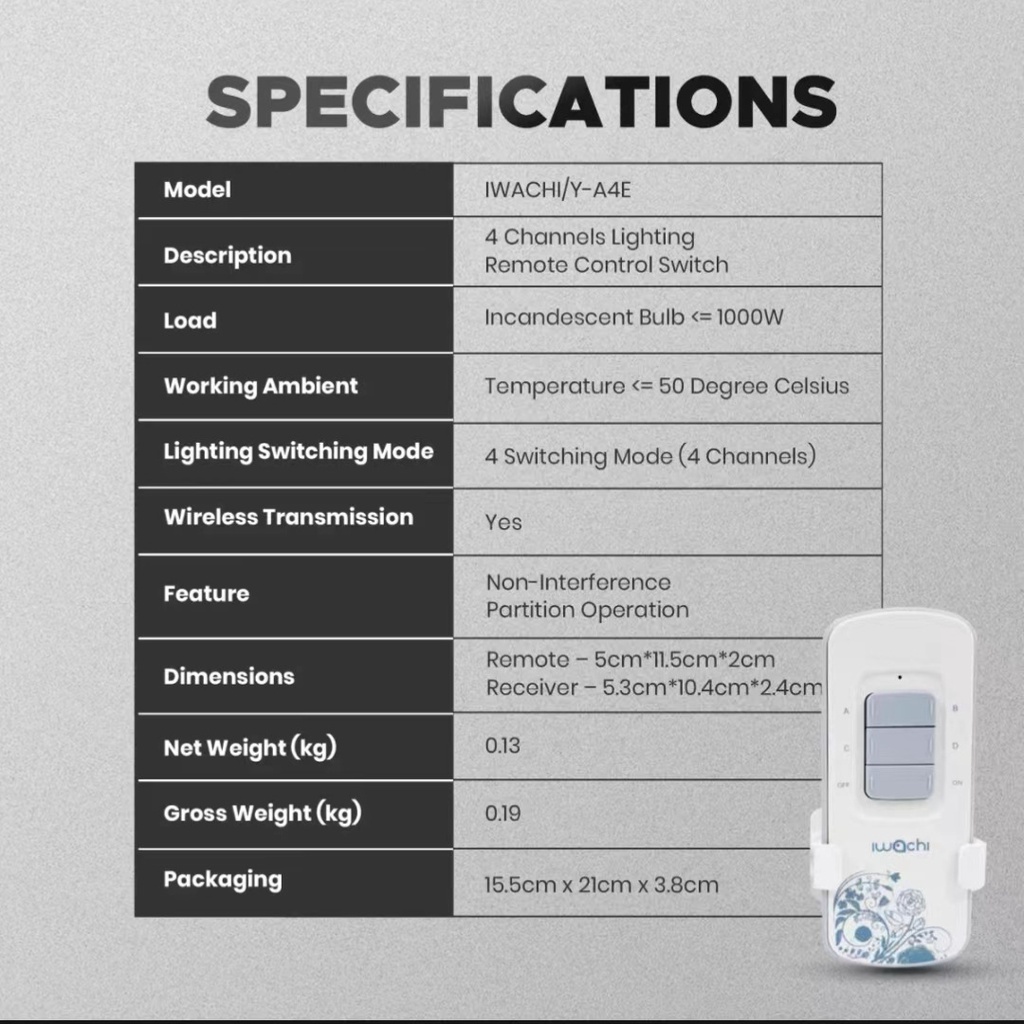 iWACHI 4ways 4x1000w Lighting Remote Control ,Switches to lamp,Including manual function, Digital Remote Control Switch