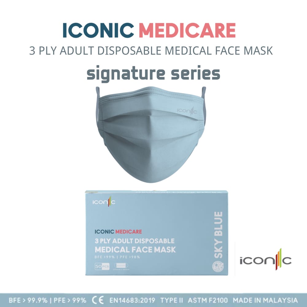 iconic ADULT PLAIN 3 PLY MASK / SIGNATURE SKY BLUE 3 PLY MEDICAL DISPOSABLE FACE MASK 50's