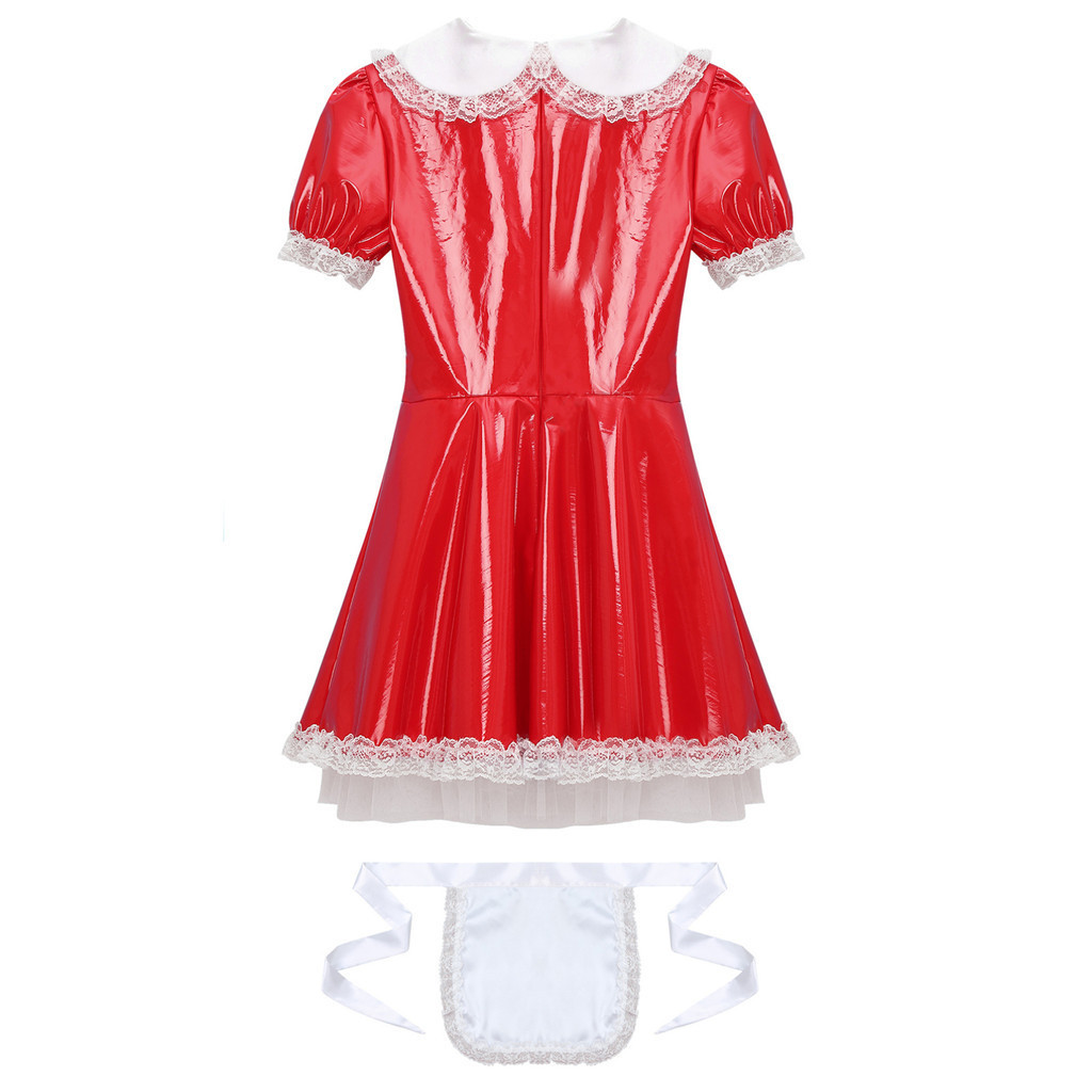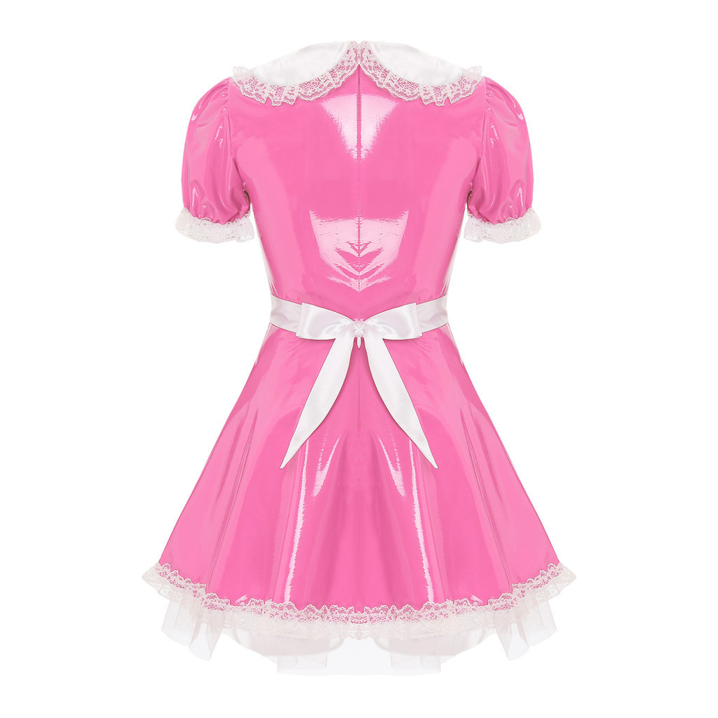 inhzoy Womens Servants Cosplay Maid Dress with Apron Doll Collar Puff Sleeve Ruffle Lace Patent Leather A-Line Dress for Masquerade Club