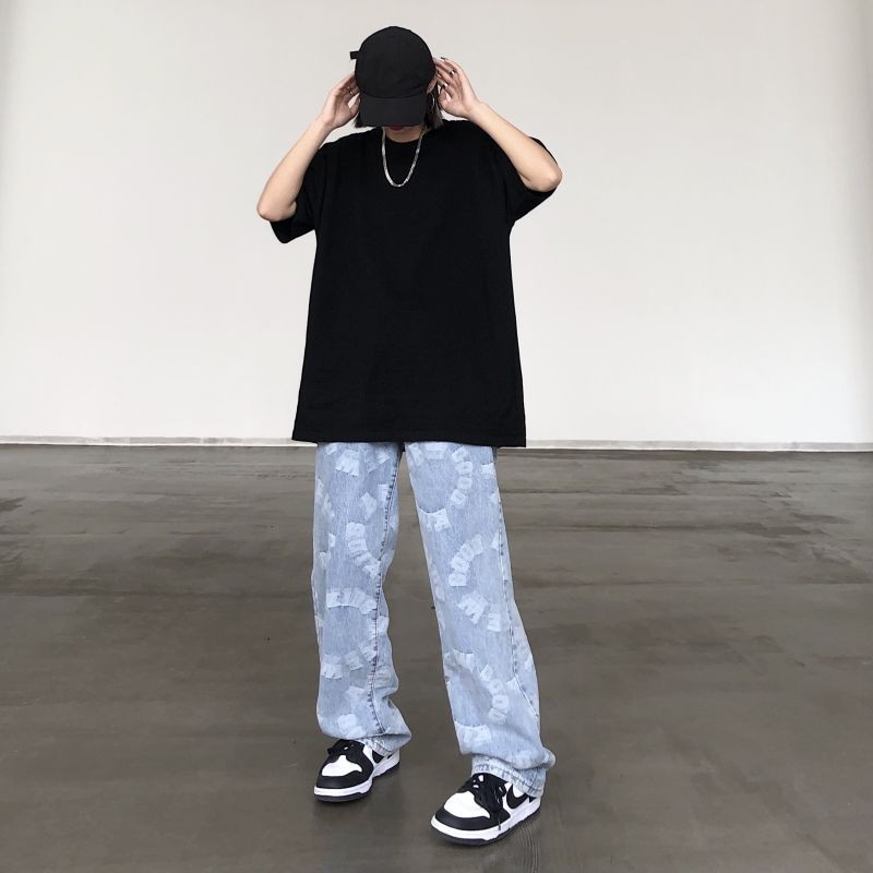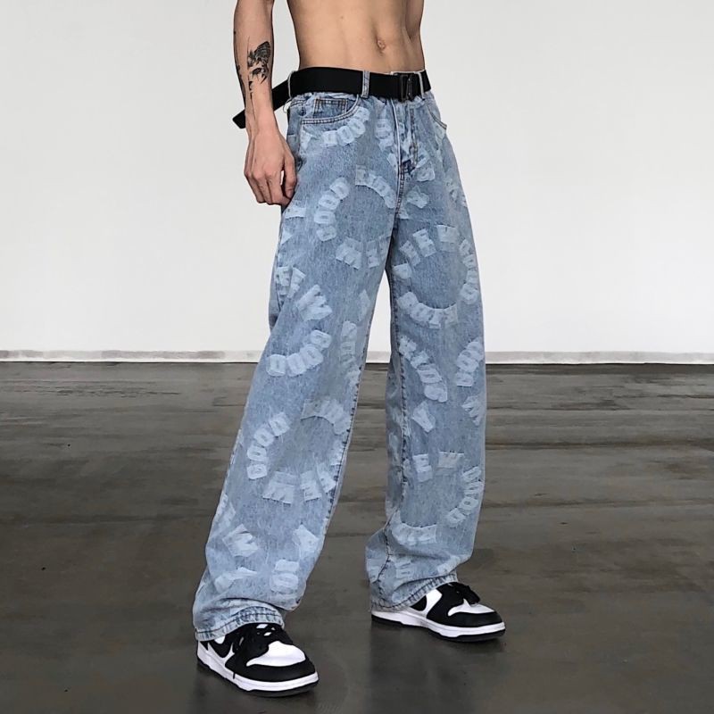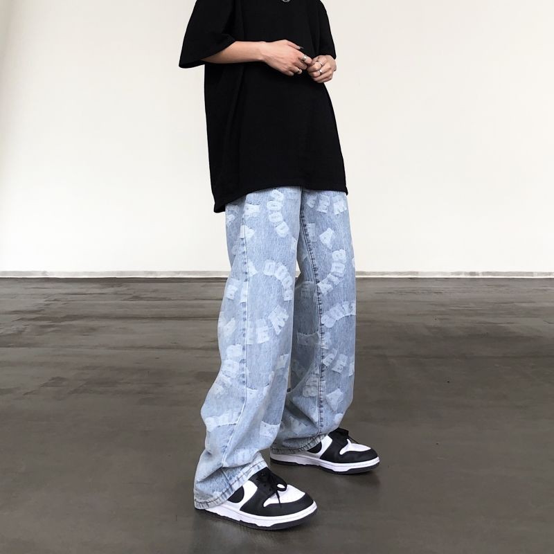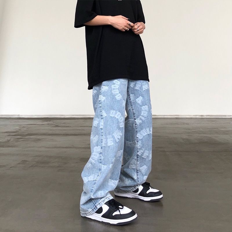 ins street hip hop straight letter printed wasshed denim seluar jeans longgar pinggang tinggi getaran lelaki dan wanita bergaya/ins street hip hop straight letter printed washed denim trousers loose high waist jeans vibe men and women trendy