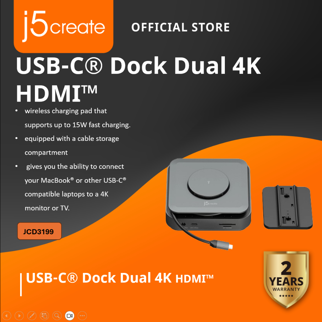 j5create JCD3199 USB-C Dock Support Dual 4K HDMI for Windows and M1/M2/M3 MacBook, Built-in 15W Magnetic Wireless Charge