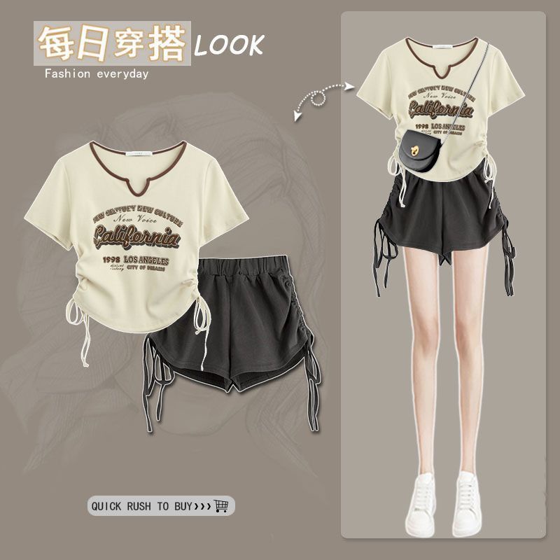 Small suit retro letter printing short-sleeved T-shirt female dr小个子套装复古字母印花短袖T恤女抽绳设计感短款上衣女+休闲短裤8.24