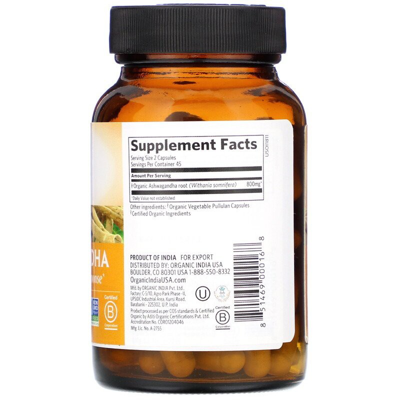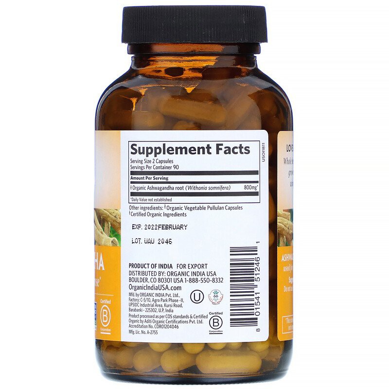 Organic India, Ashwagandha, 90 / 180 Vegetarian Caps (400 mg per Capsule)