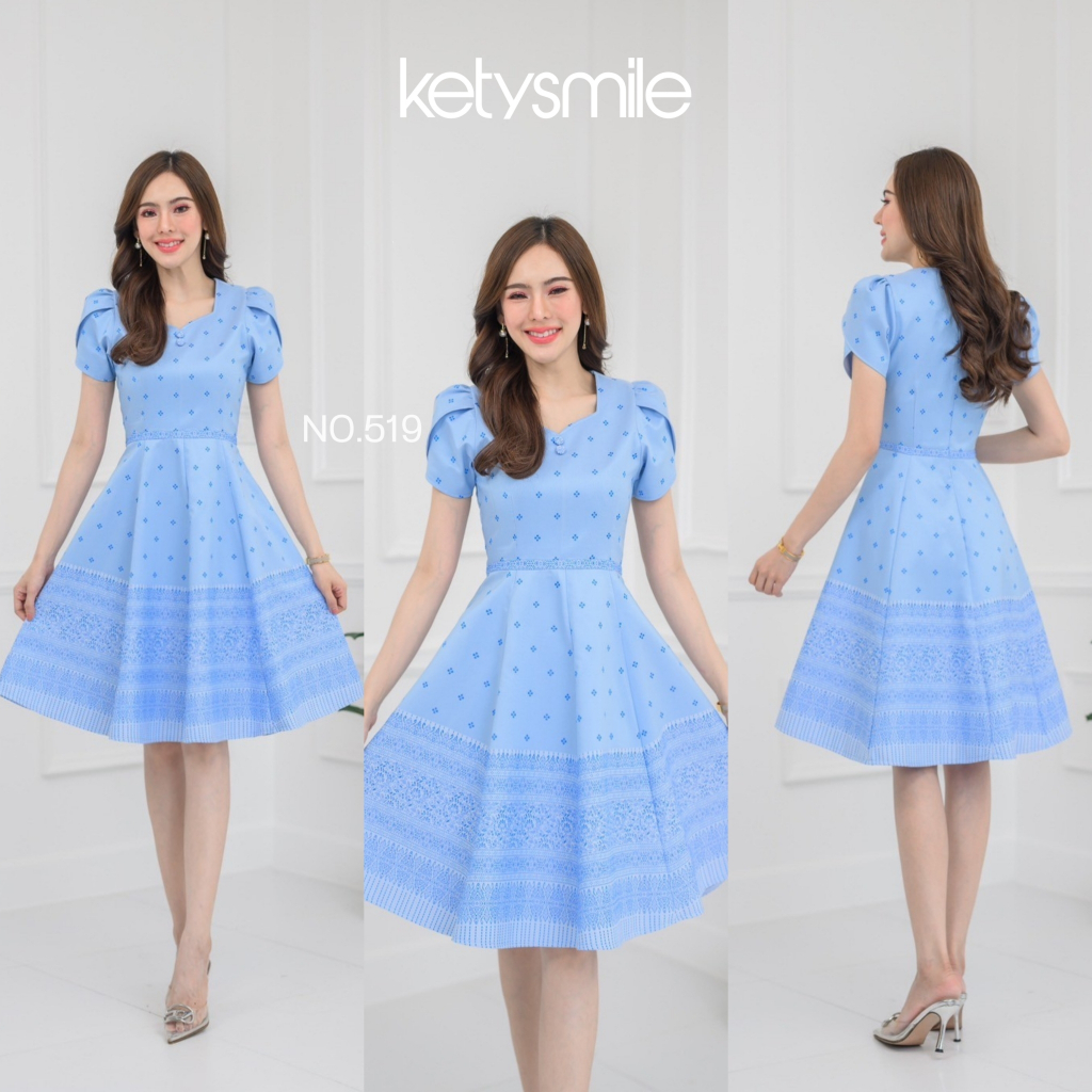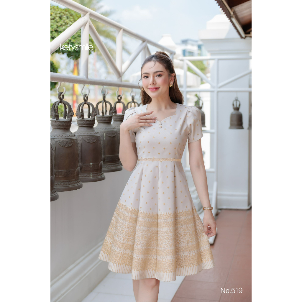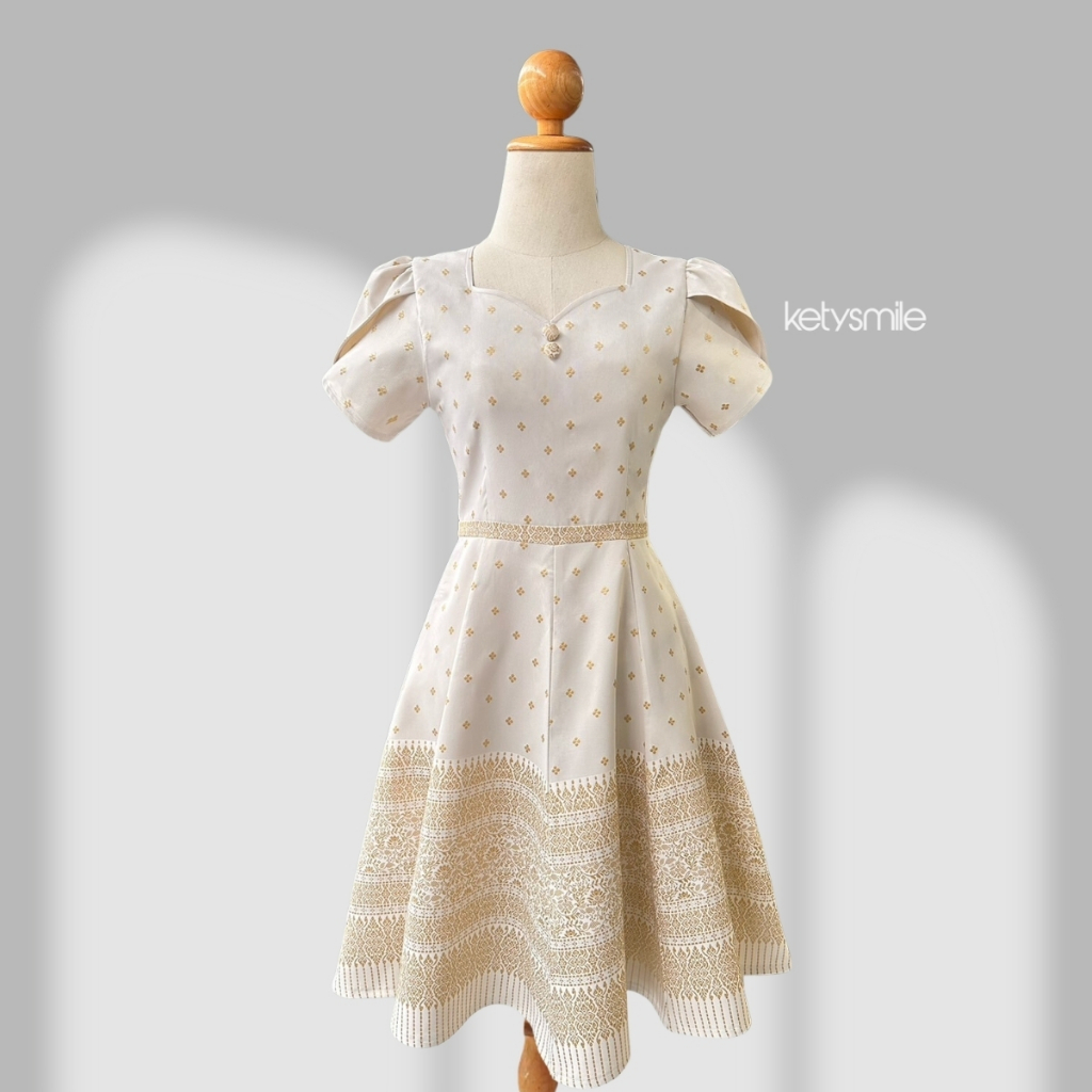 Kety Smile Silk Woven Dress 8-Piece Flared Skirt Heart-Shaped Stamped Buttons Decorated With Lotus Petal Sleeves (S-5XL) N519