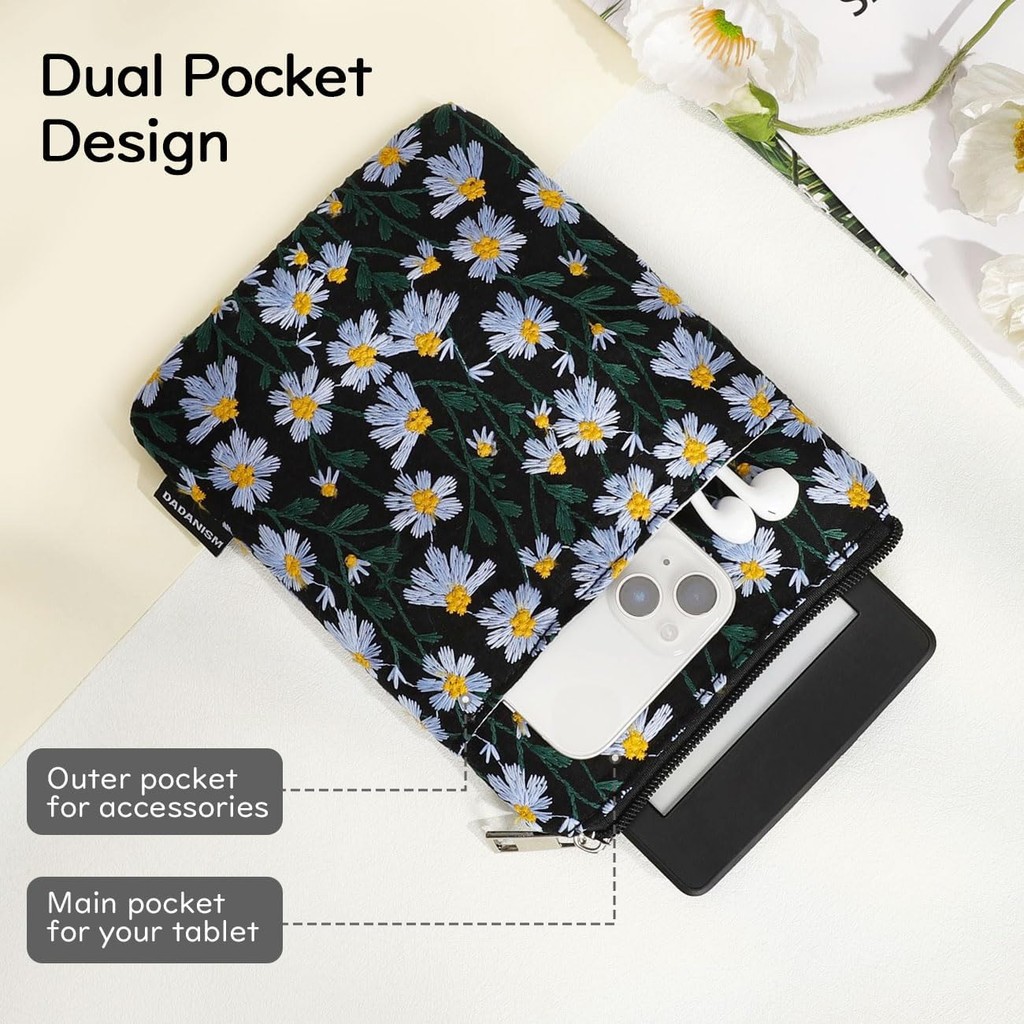 Dadanism Embroidered Daisy Padded Sleeve for Kindle Paperwhite 7" Kindle Colorsoft Signature Edition,Slim Tablet Pouch Protective Sleeve Case for 6" Kindle/Oasis/Kobo E-Reader