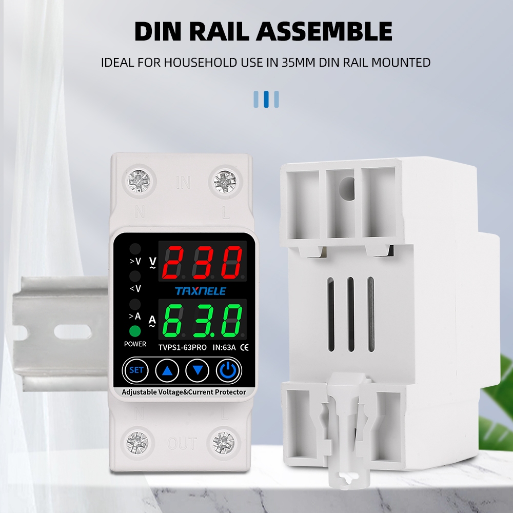 Dual Display 63A 230V Din Rail Adjustable digital Over Under Voltage Protector Current Protection