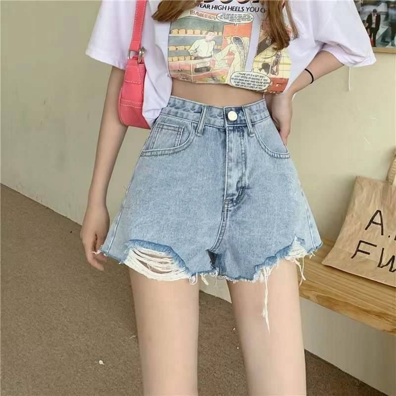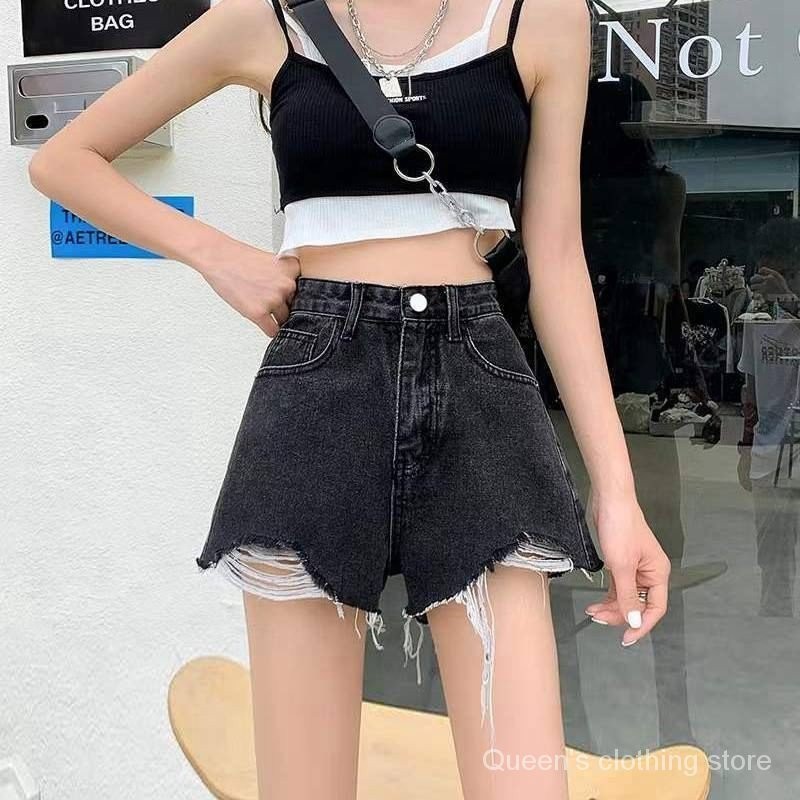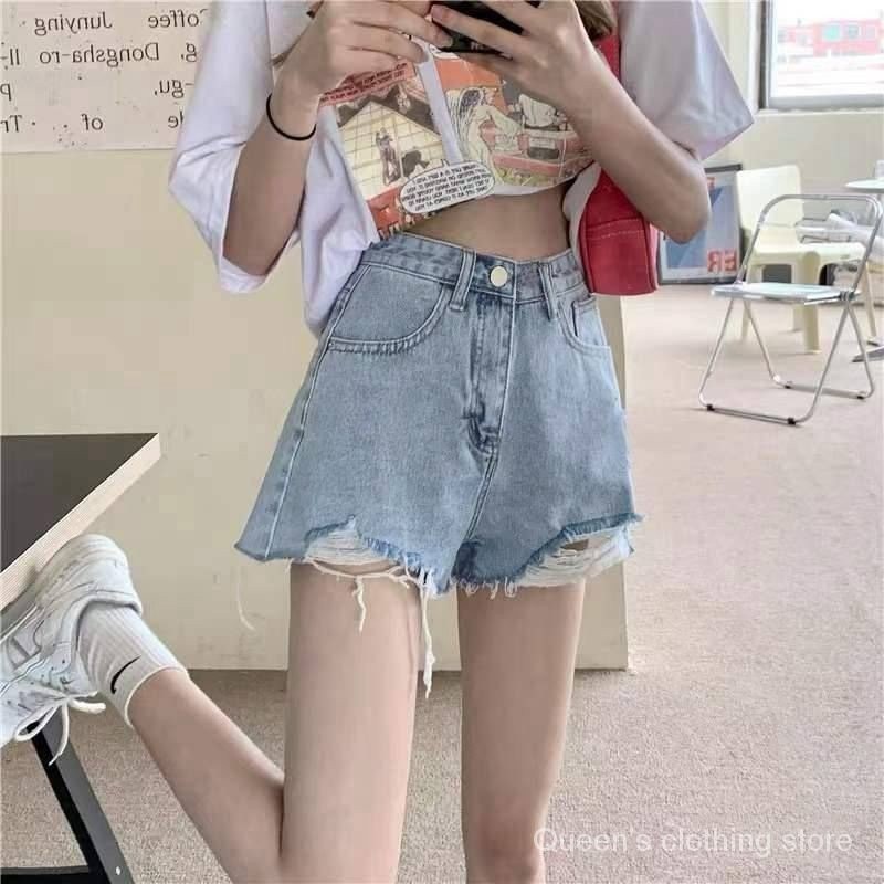 🍒Ready Stock🍒网红破洞高腰牛仔短裤女夏辣妹不规则阔腿宽松a字裤毛边热裤子潮Denim Shorts for Women