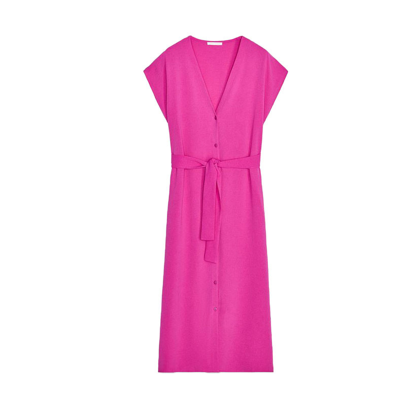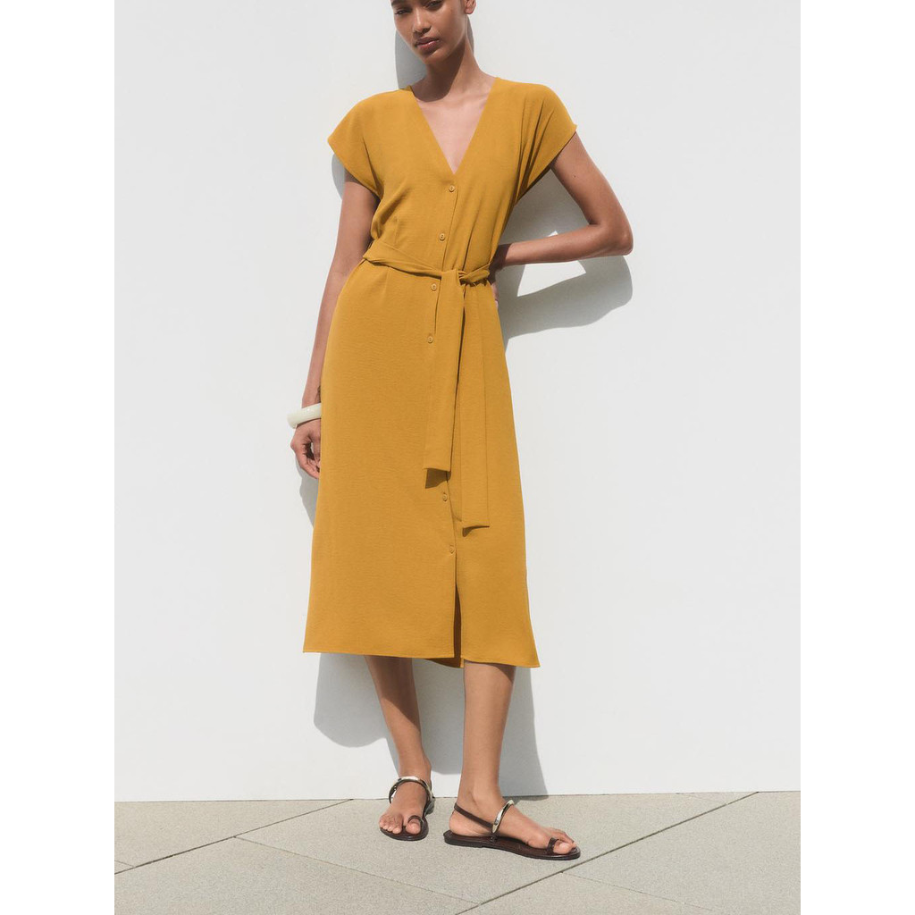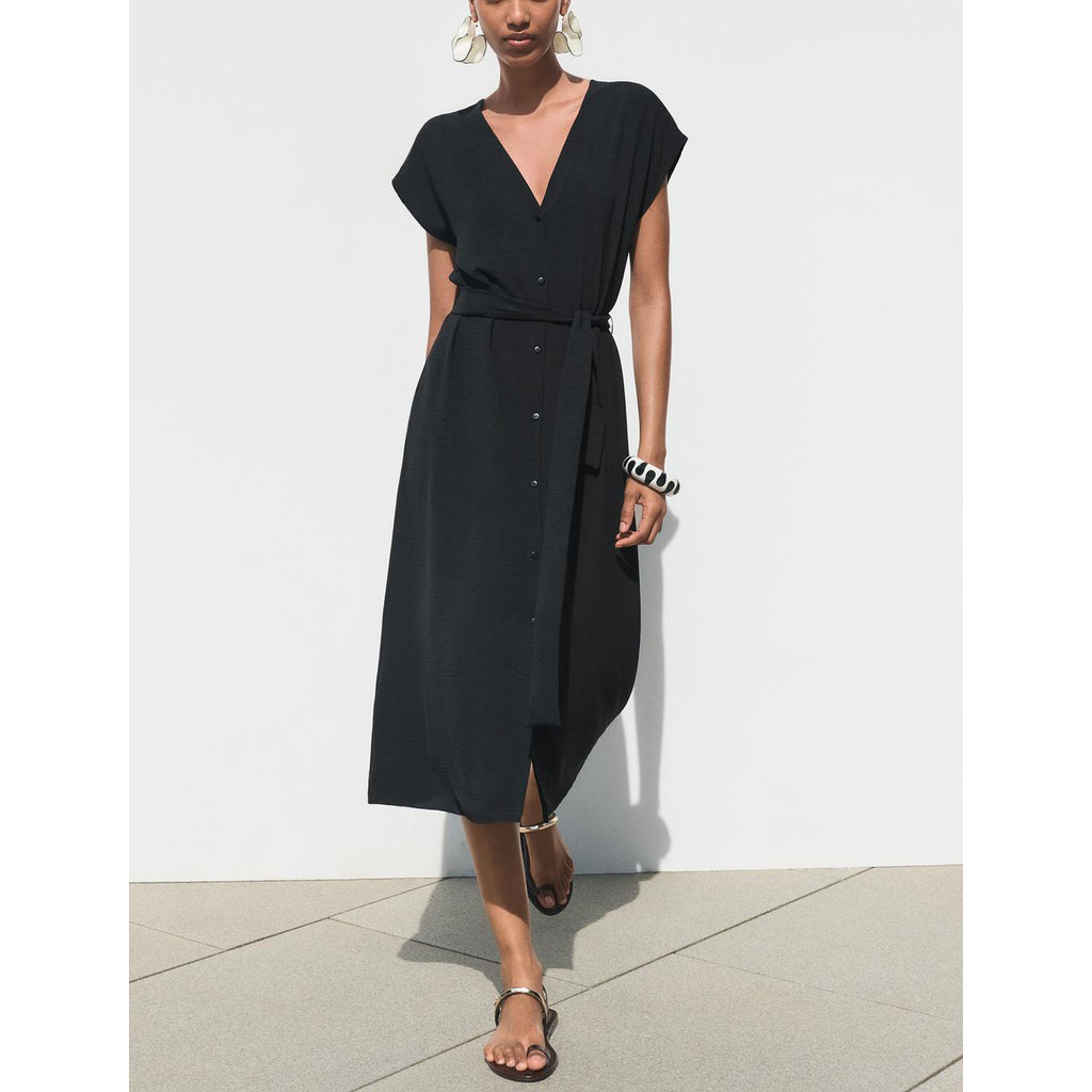 ZARA V-Neck Dangling Shoulder Short-Sleeved Belt Drape Dress 1165265