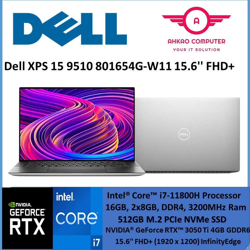 Dell XPS 15 9510 801654G-W11 15.6'' FHD+ Laptop Silver ( I7-11800H, 16GB, 512GB SSD, RTX3050Ti 4GB, W11, HS )