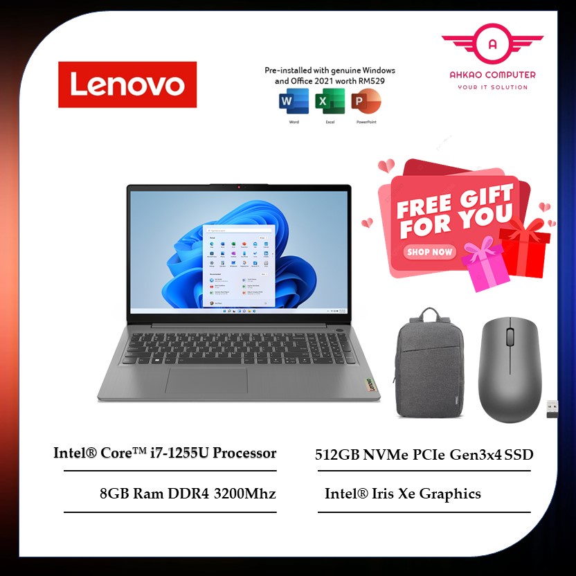 Lenovo IdeaPad 3 15IAU7 82RK00FVMJ 15.6'' FHD Laptop Arctic Grey ( I7-1255U, 8GB, 512GB SSD, Intel, W11, HS )2 Year