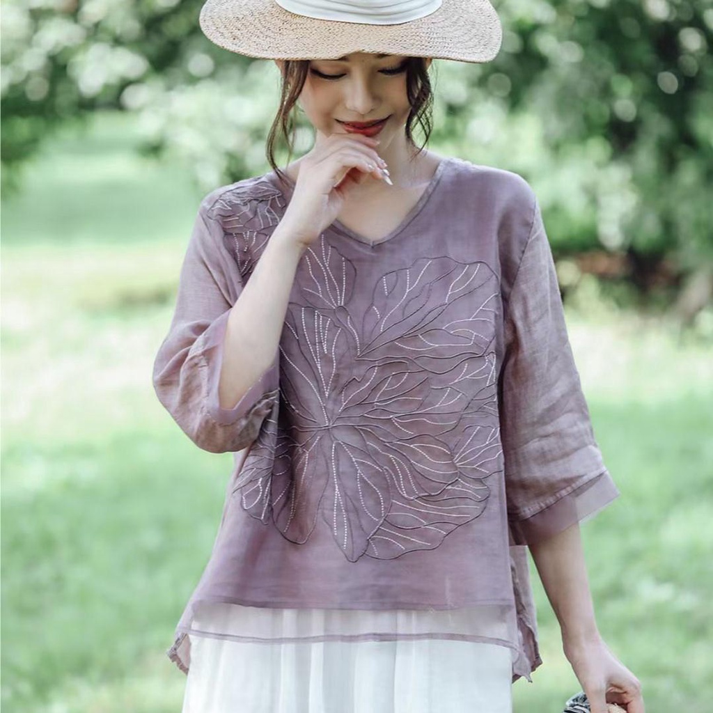 Cotton and Linen Blouse Plus Size Women's Summer Loose V-neck Embroidered Shirts