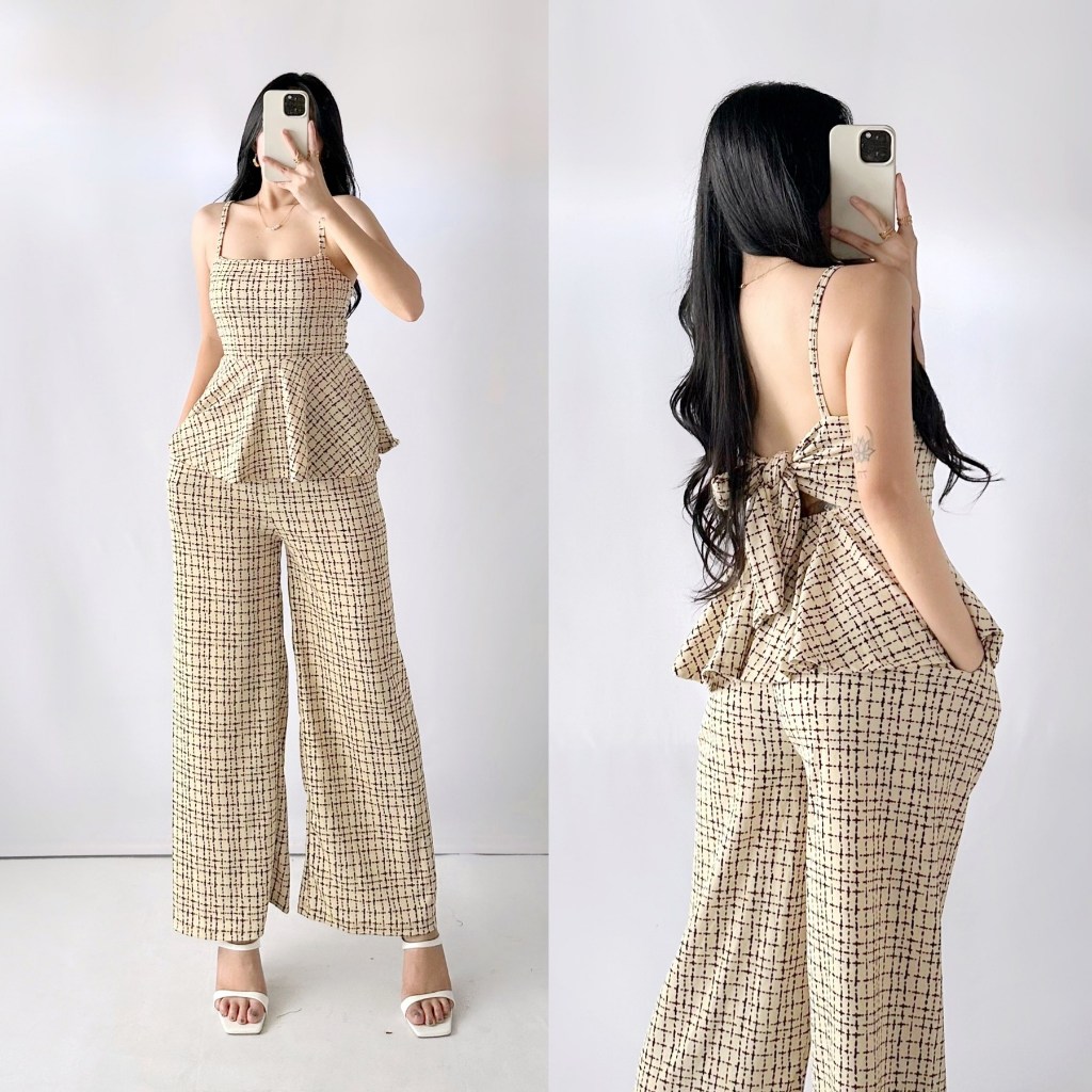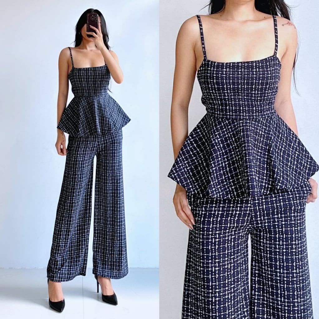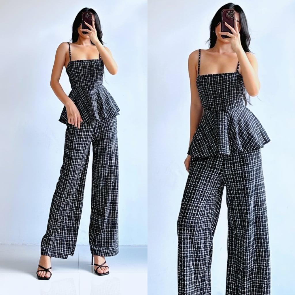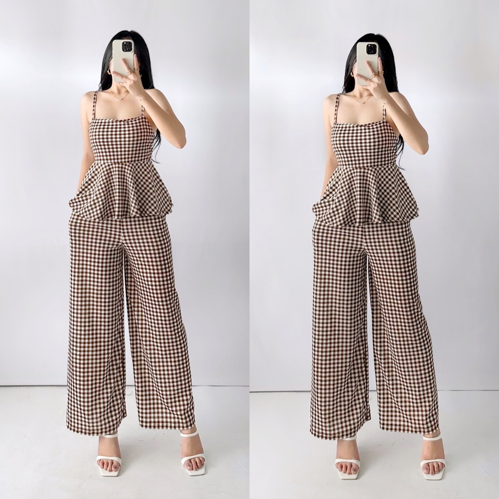Checkered Print Casual Crepe Terno with Peplum Top and Wide Leg Pants | DA&ABOUT THE FIT (QUENNIE)