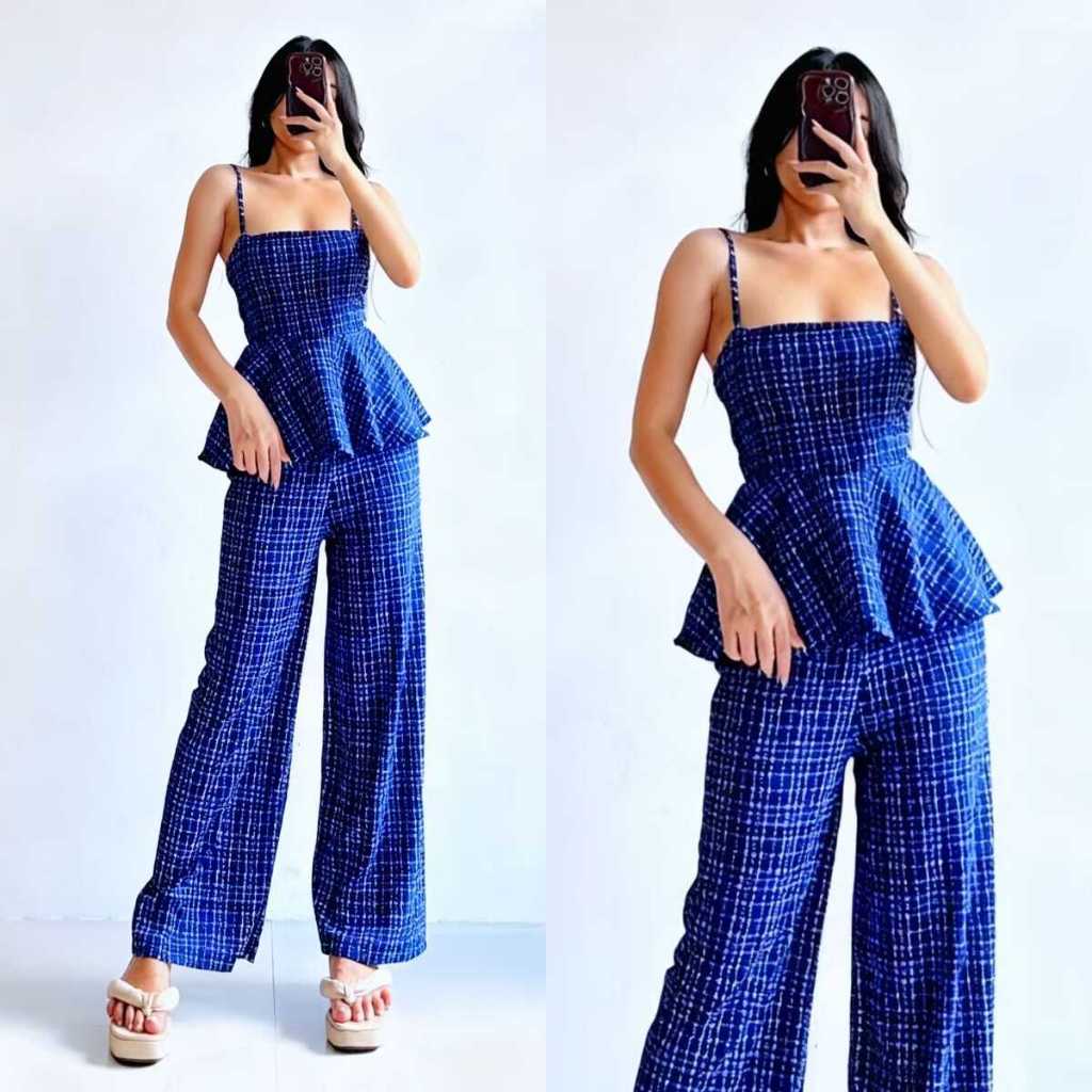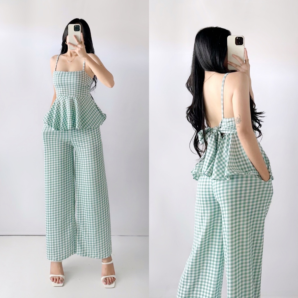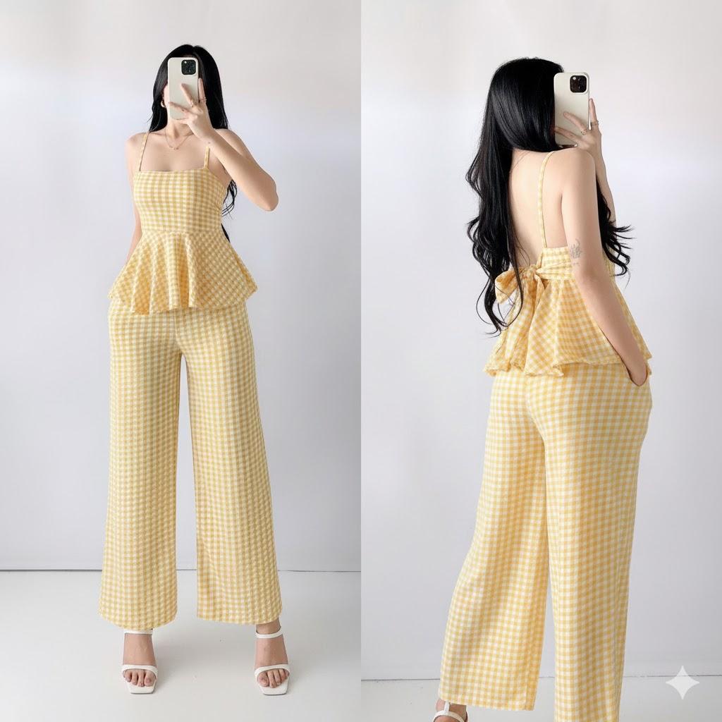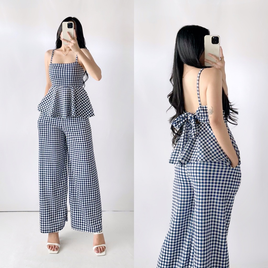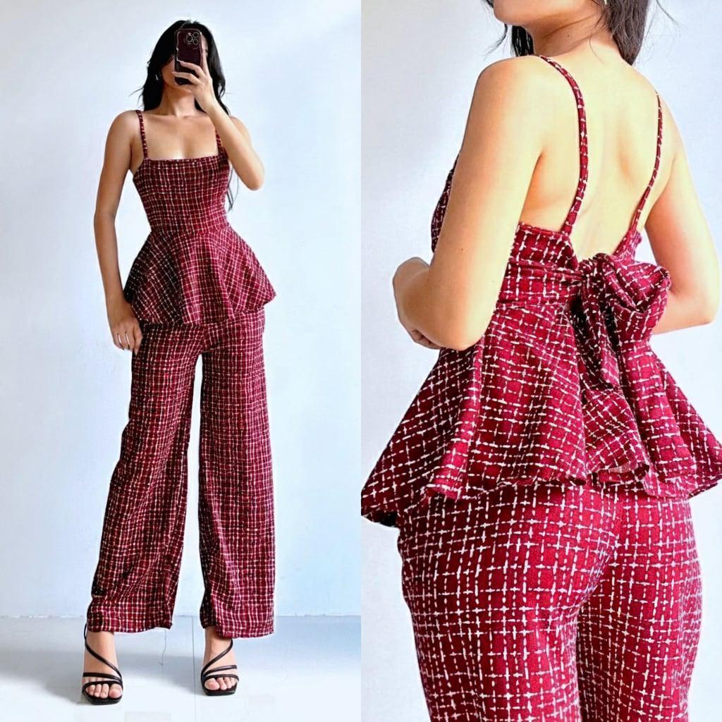 Checkered Print Casual Crepe Terno with Peplum Top and Wide Leg Pants | DA&ABOUT THE FIT (QUENNIE)