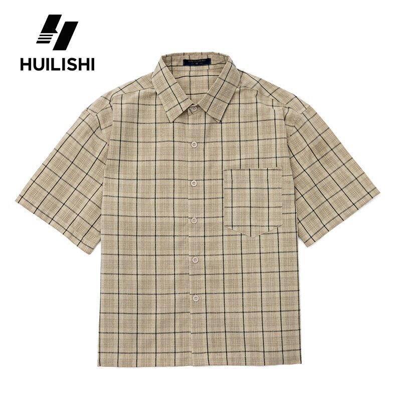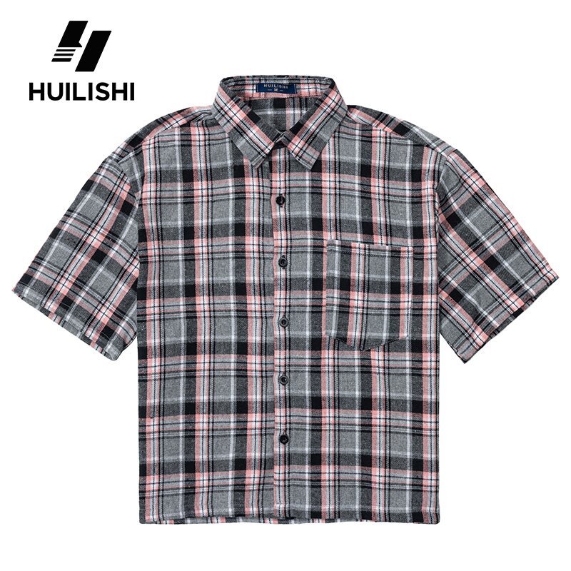 HUILISHI Box Fit Polo for Men Crop Top Plaid cotton short-sleeved Korean style shirt