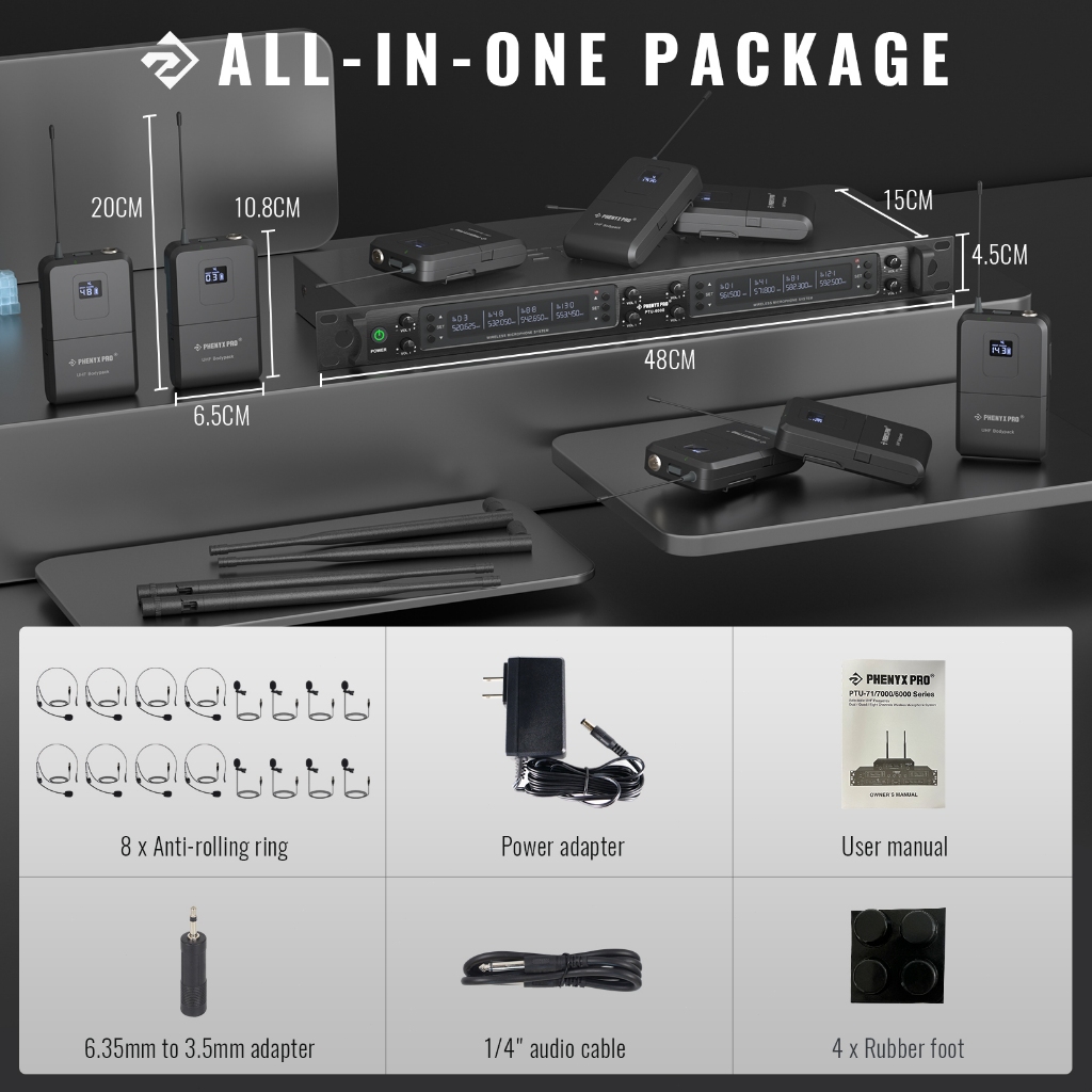 Phenyx Pro PTU-6000B 8-Channel UHF Wireless Microphone System 8 Bodypacks Headsets/Lapel Mics