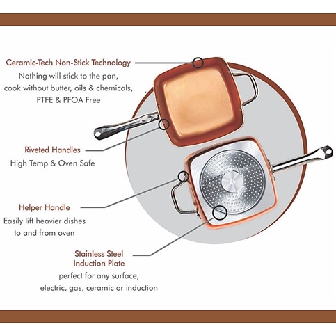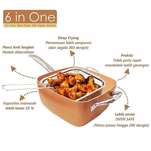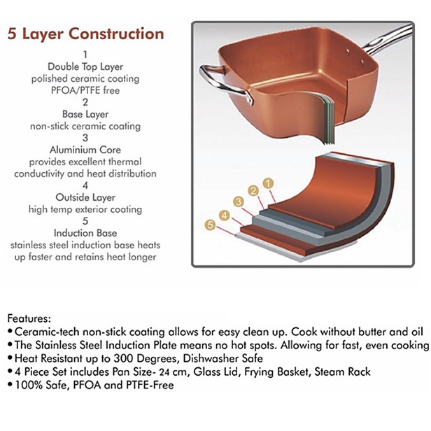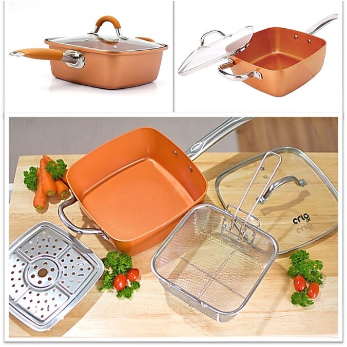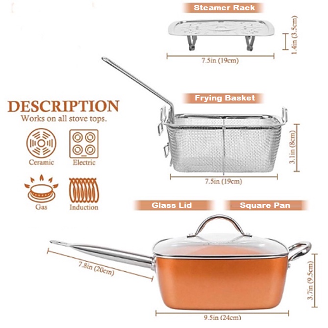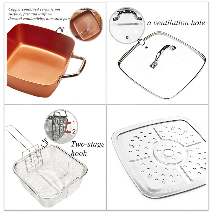 5 Pcs Set Non Stick Copper Ceramic Casserole Square Deep Frying Pan Cooking Pot Wok Basket Steamer Cookware + Glass Lid