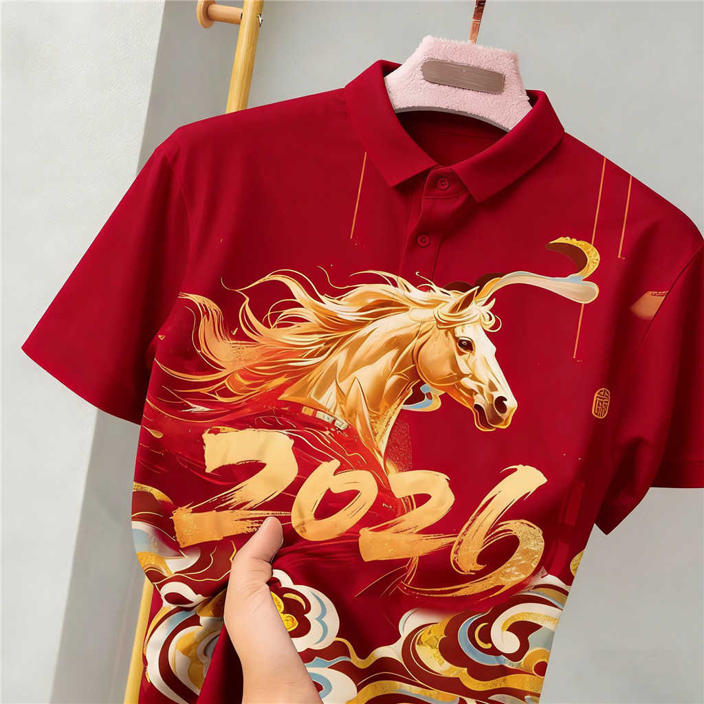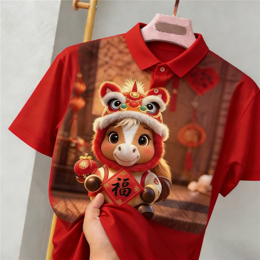Pakaian perayaan 2026 New Year Chinese Year of The Horse Full Print 中国新年 Unisex Short-Sleeve Polo-Shirt (Family Parent Outfit)