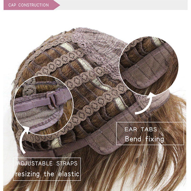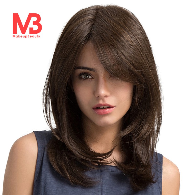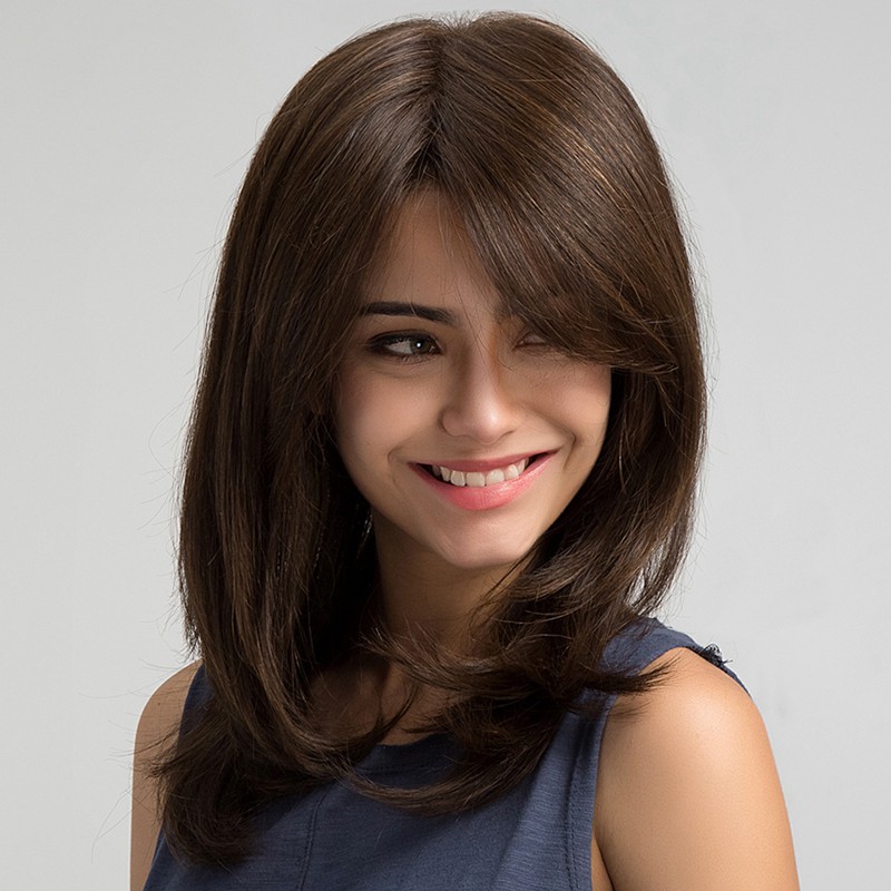 Women Hair Wigs Ladies Party Daily Natural Wave Dark Brown Side Parting Synthetic None Lace Wigs with Bangs