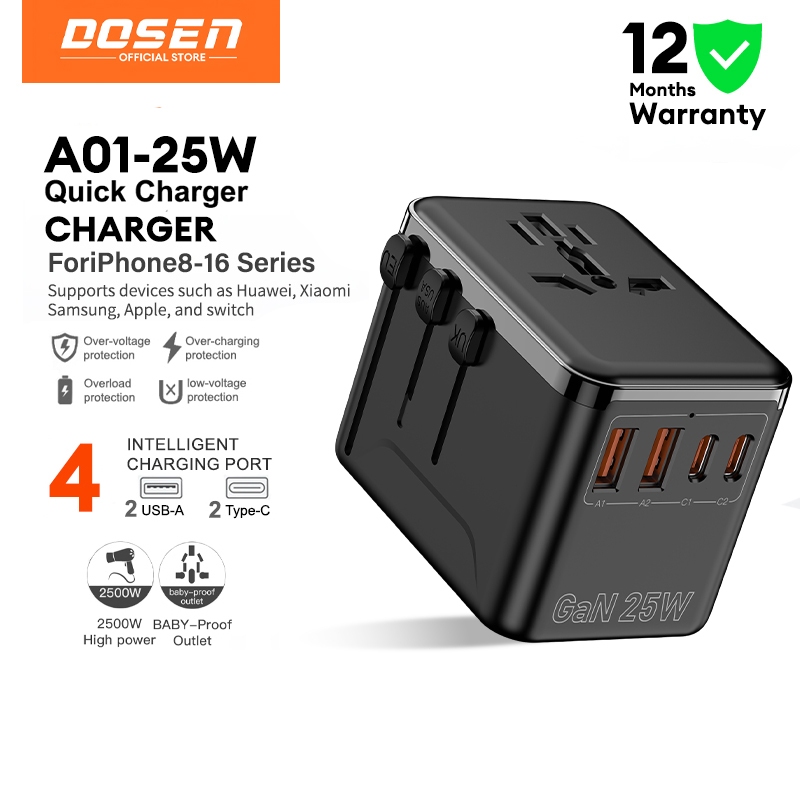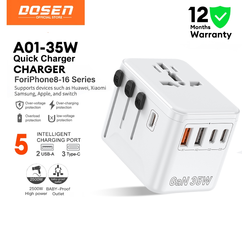 DOSEN Universal Adapter Travel International 35W USB C Adapter Fast Charger QC 3.0 Charger Type C Plug