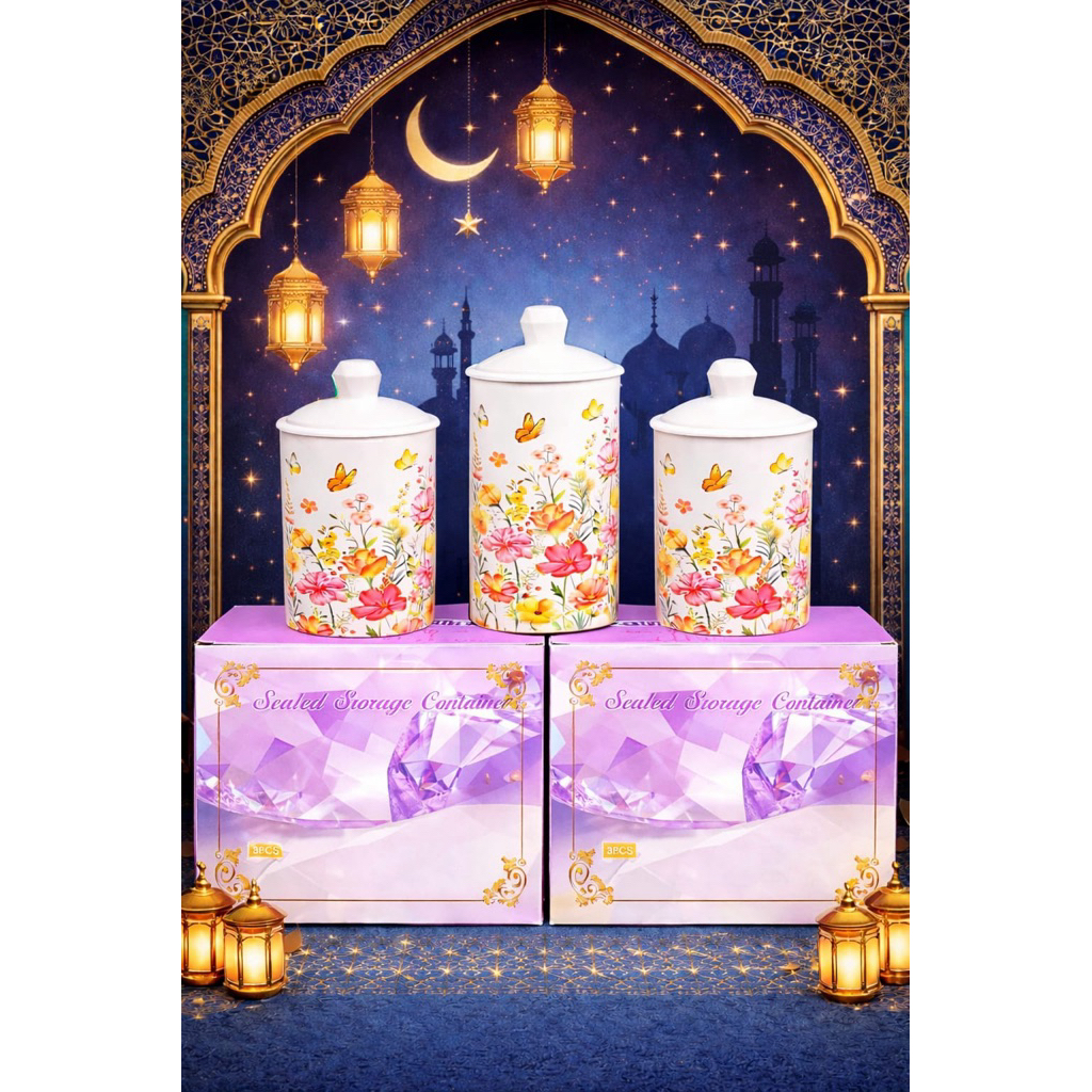 Sultan Jar with Aesthetic Butterfly Flower Motif - Sultan Jar with Aesthetic Motif - Sultan Jar Contains 3 PCS Different Sizes - Jar Size 1000ML, 800ML, and 600ML - Sultan Jar Suitable for Eid or Used as Hampers