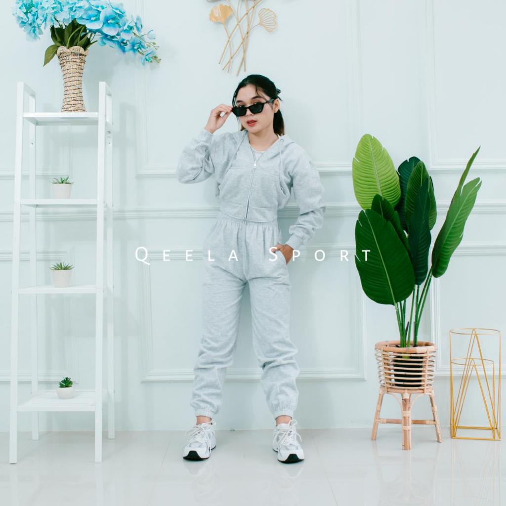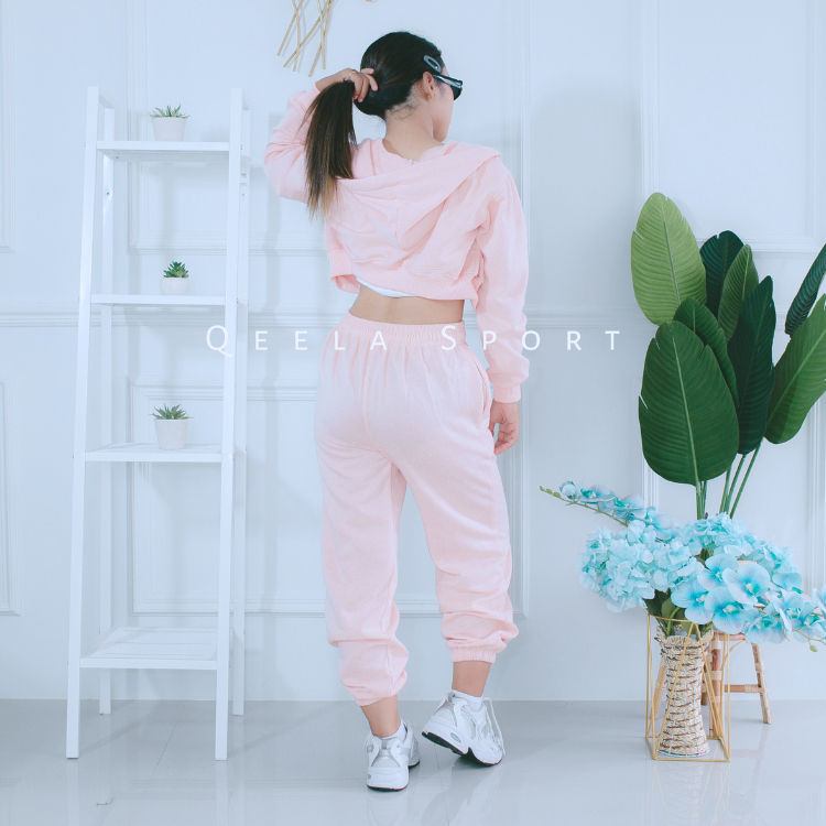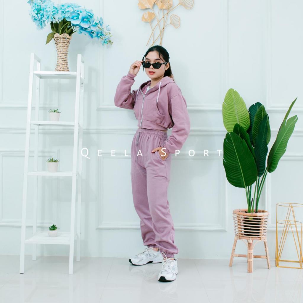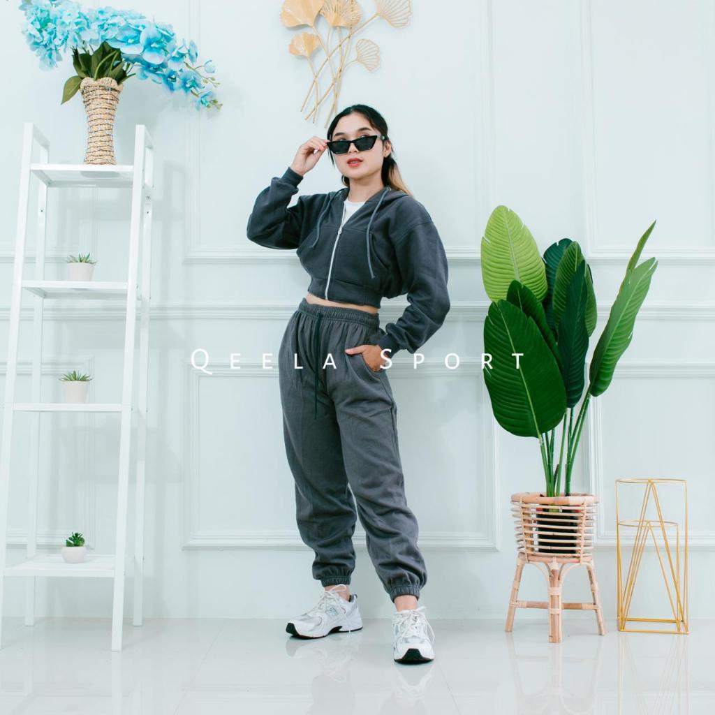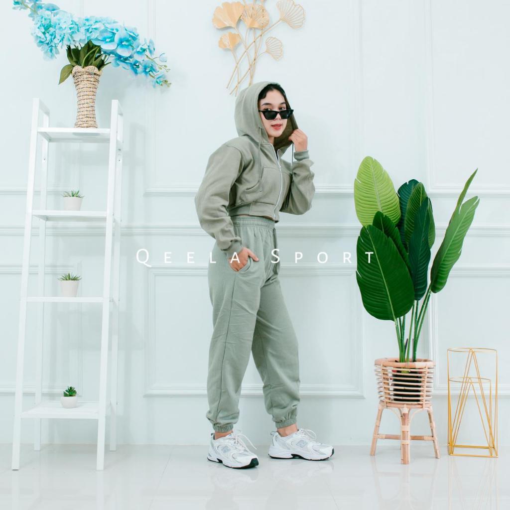 QeelaOfficial - ONE SET HOODIE ZIPPER CROP + LONG JOGGER PANTS SWEATPANTS WOMEN'S SUIT KOREAN STYLE